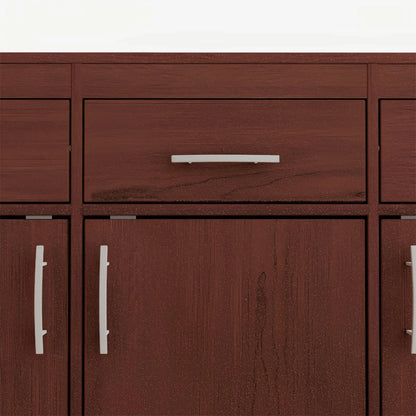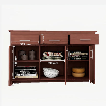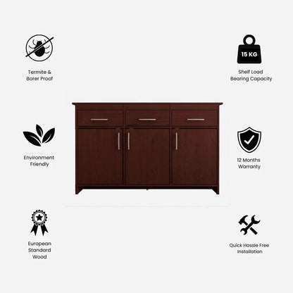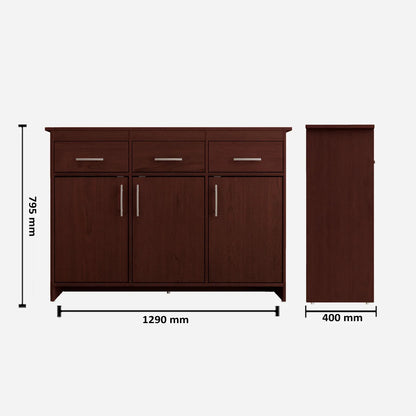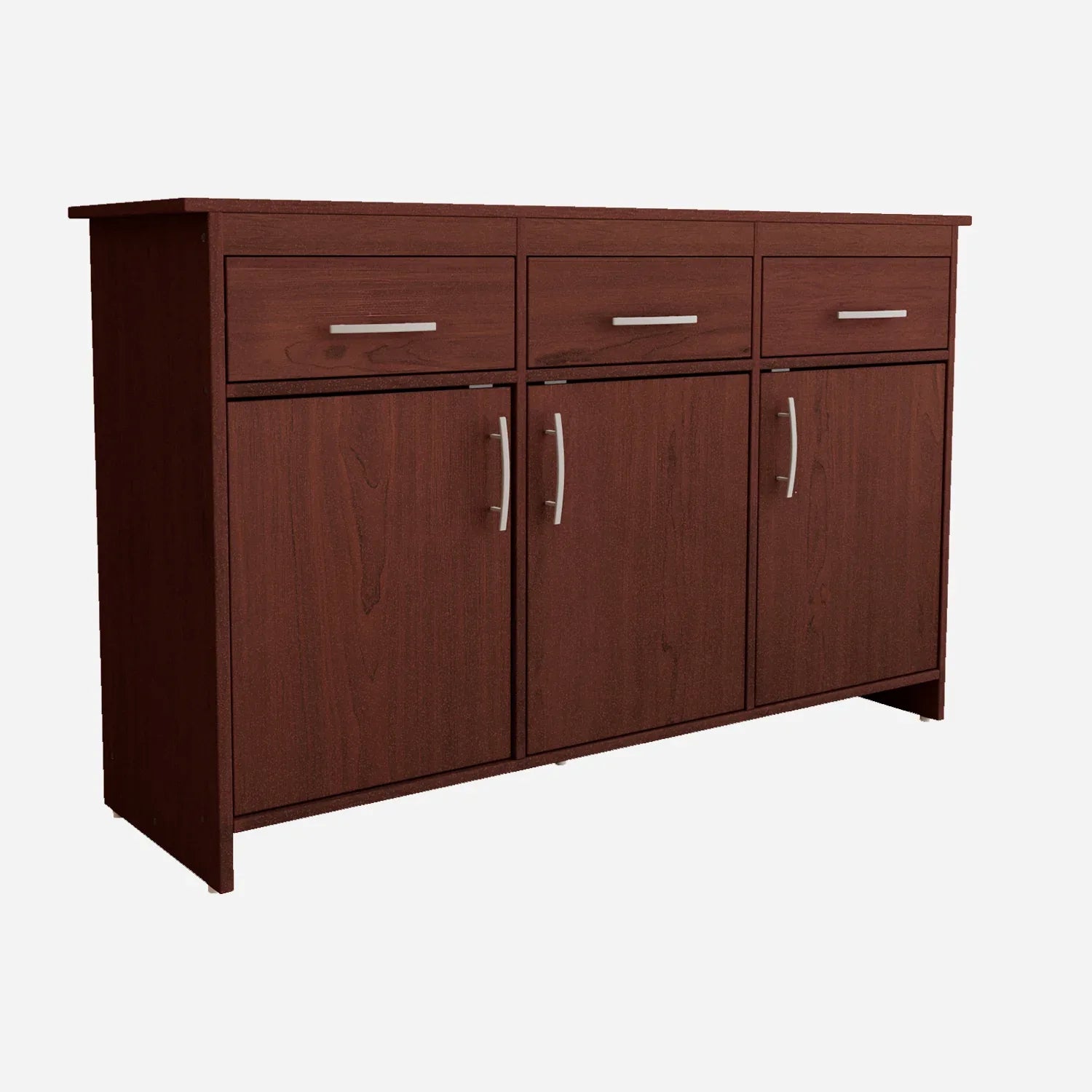 The Albert three door cabinet with modern steel finish door and drawer handles, adds a simple and modern touch to your best of storage and decor furniture. Spruce up your space with placing your favorite home decor and magazine on the cabinet top and store items in the drawers easy accessibility like keys, stars, cutlery, etc. The natural wood grain finished, cherry brown cabinet can also store taller items in the lower three door space provided with a floor clearance for ease of cleaning.