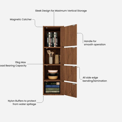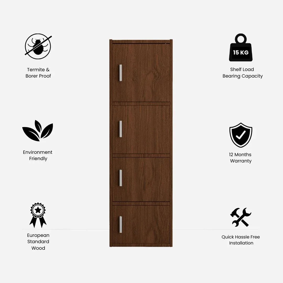The modern Albert Cabinet occupies a small corner of your space providing maximized storage solutions. The four tier cabinet crafted from engineered wood can be used for storing a variety of items from books, magazines, kids storage, bed and bath storage etc. With natural wood grain finish, the rack merges with any themed rooms with magnetic doors to keep the dust away, available in cherry brown and oak finish.