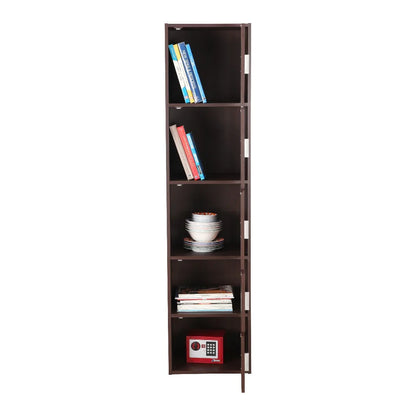 The modern Albert Cabinet occupies a small corner of your space providing maximized storage solutions. The five tier cabinet crafted from engineered wood can be used for storing a variety of items from books, magazines, kids storage, bed and bath storage etc. With natural wood grain finish, the rack merges with any themed rooms with magnetic doors to keep the dust away, available in cherry brown and oak finish.