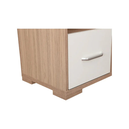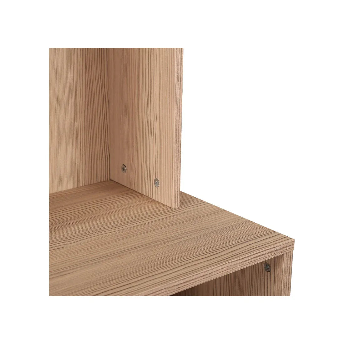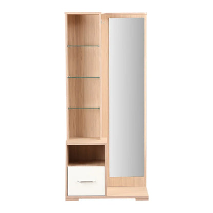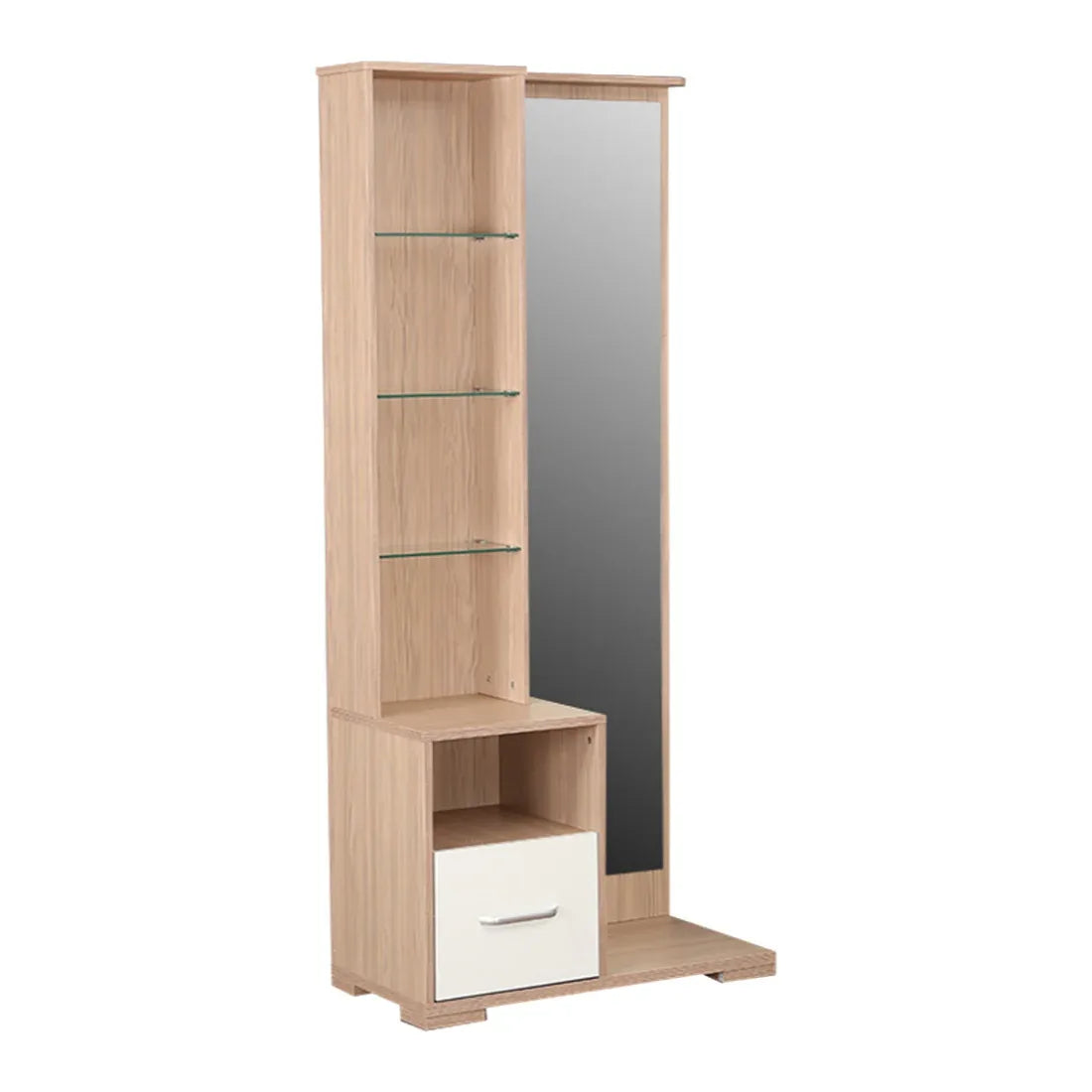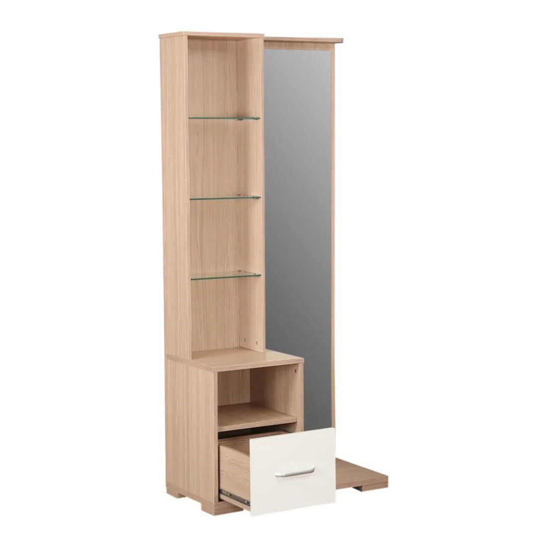 The oak-colored Ambra dresser with full length mirror and natural wood grain finish breathes freshness with its light texture and modern silhouette. The distinct high gloss white drawer shutter with leveled shelf space and attached hooks, makes this a highly functional pick.