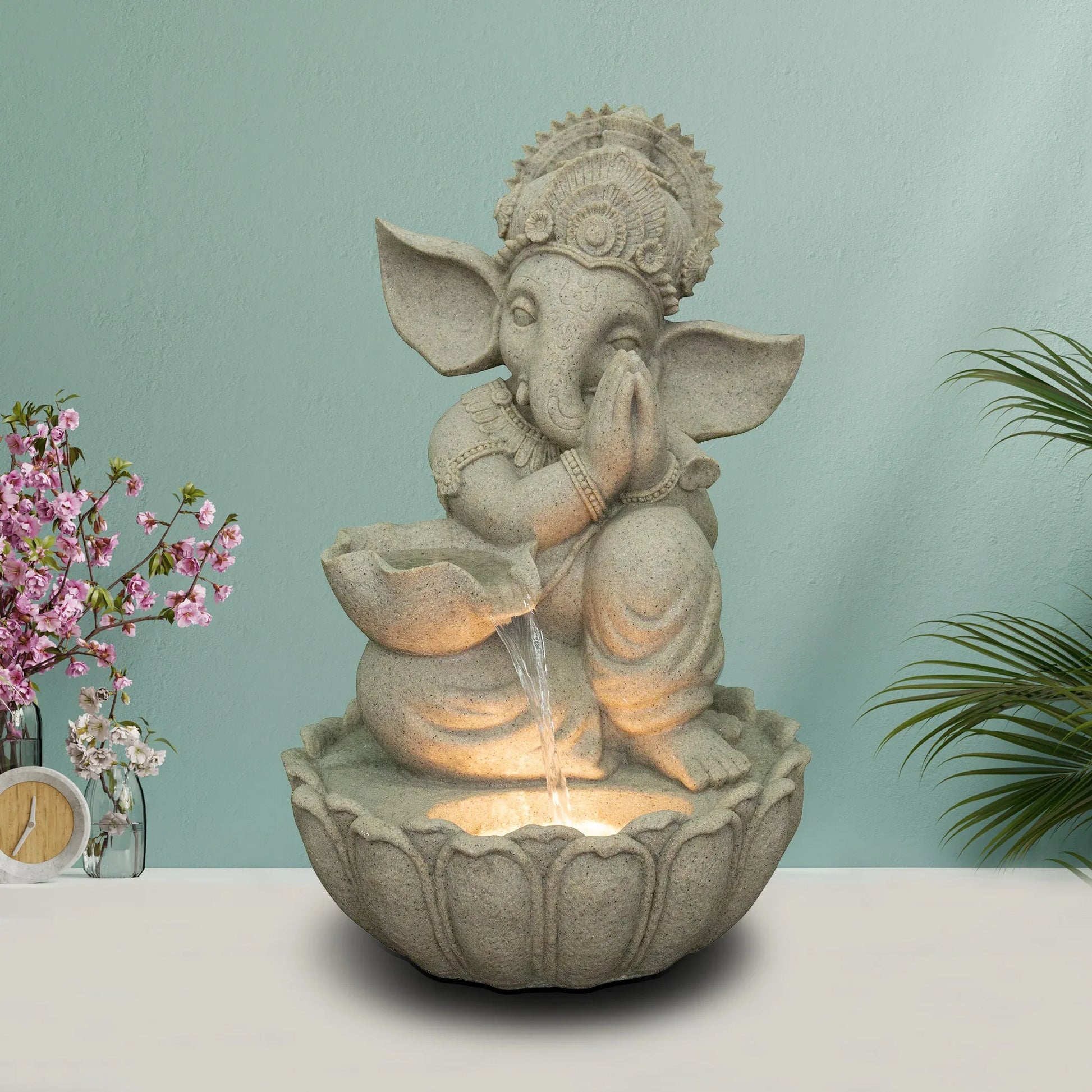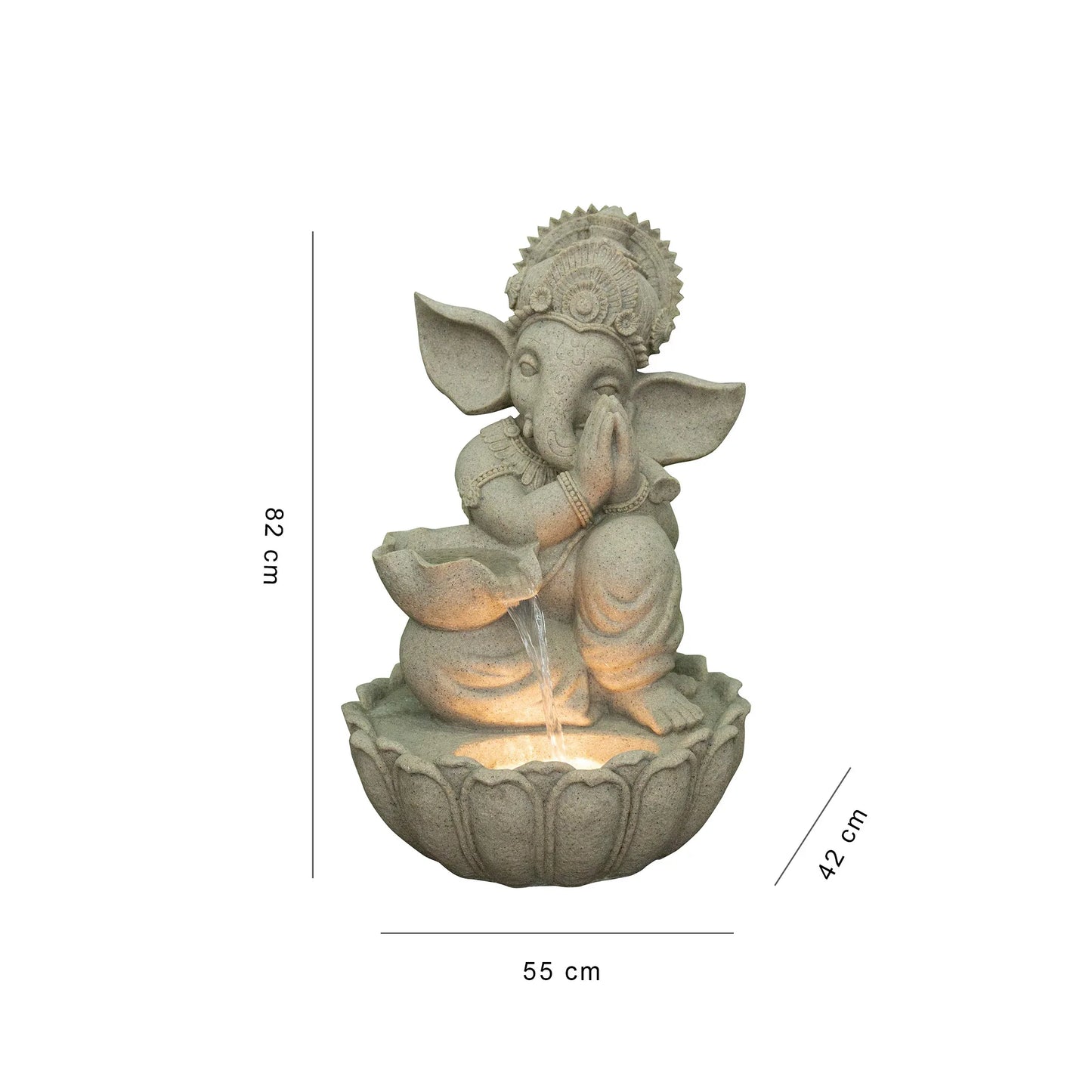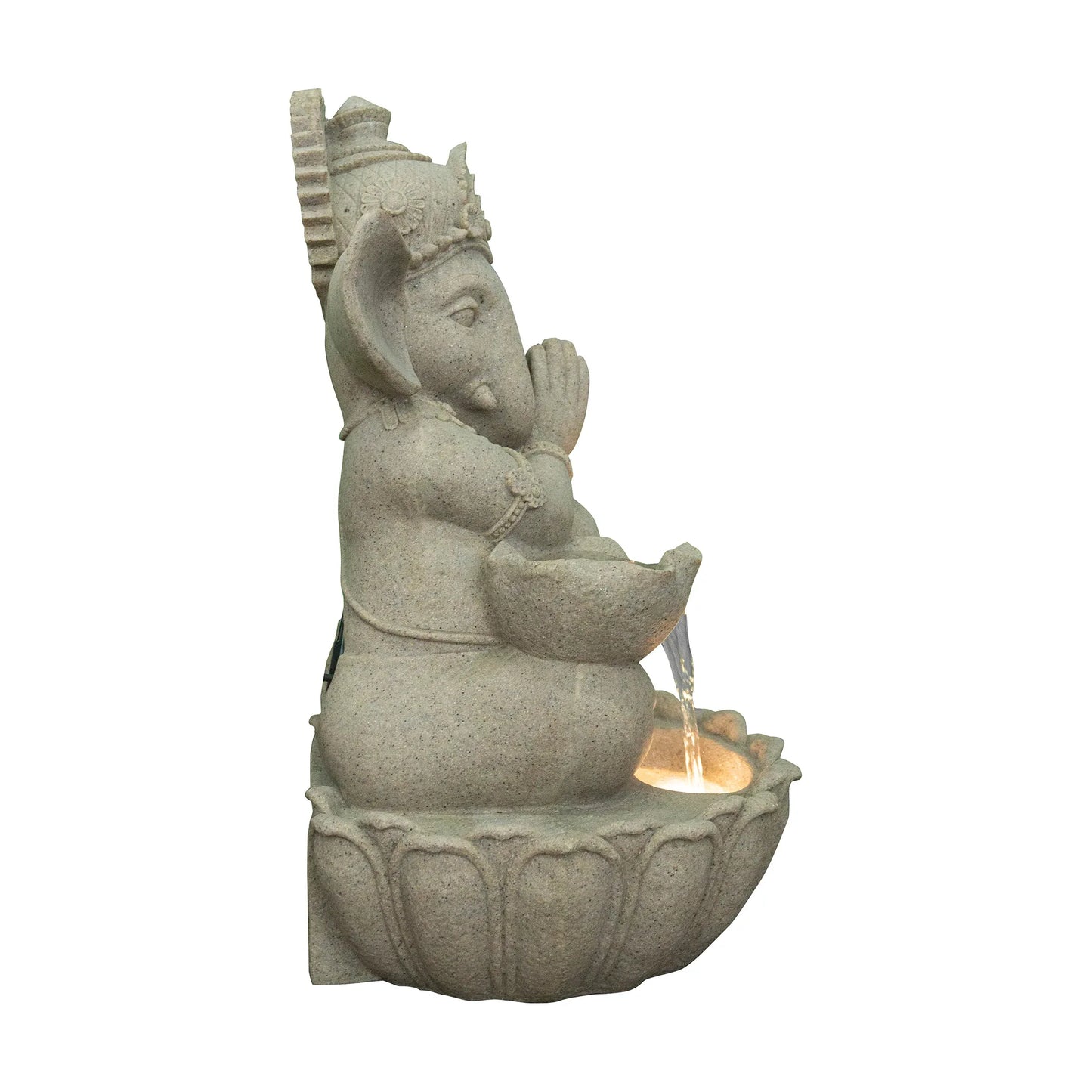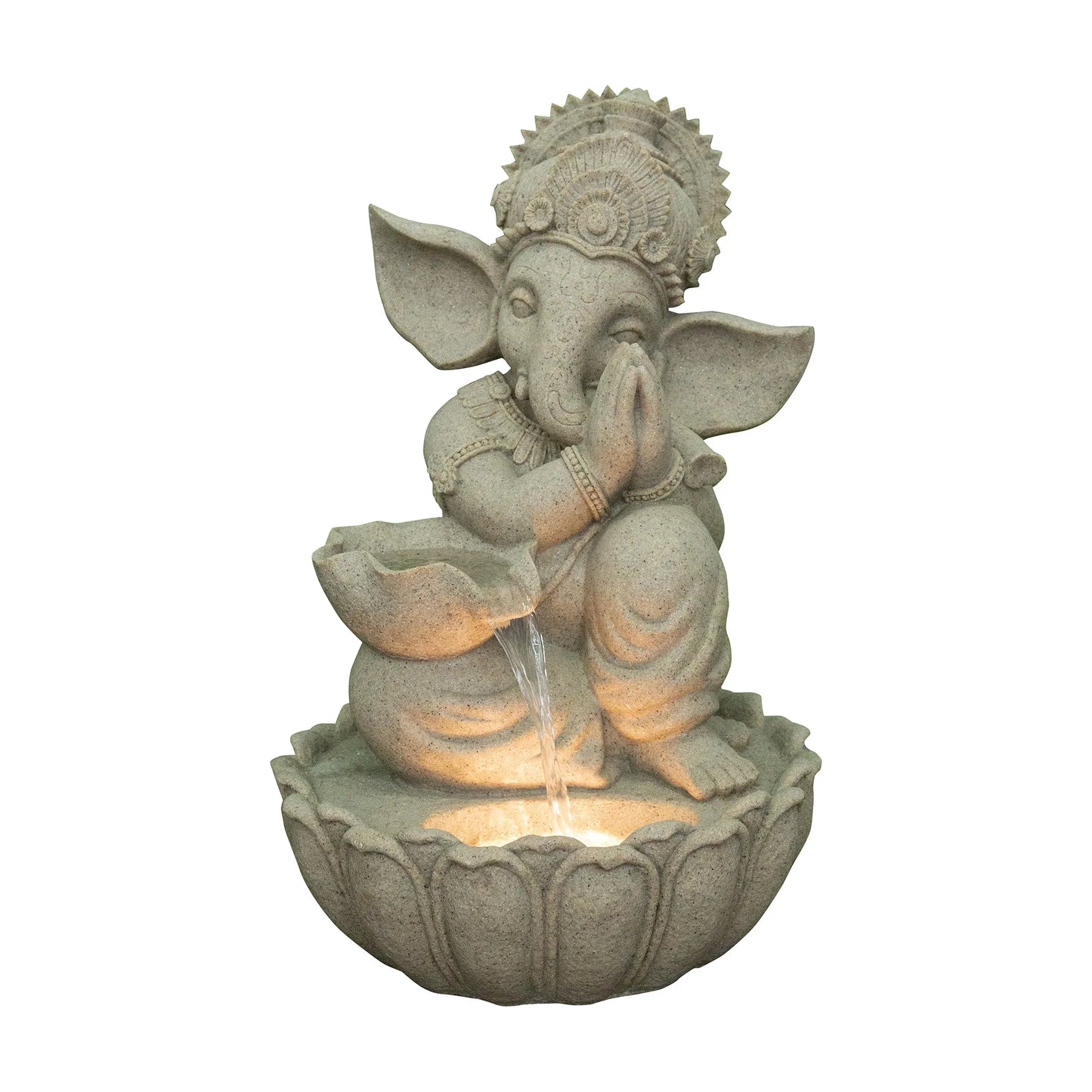 - Revive the countrys tradition with this Ganesha figurine water fountain in the ages old "namaste" position. The raw, rustic look of sandtsone material enhances the aesthetic appeal of this work of art. Alongside, the earthy tan hue brings the best of both worlds together!