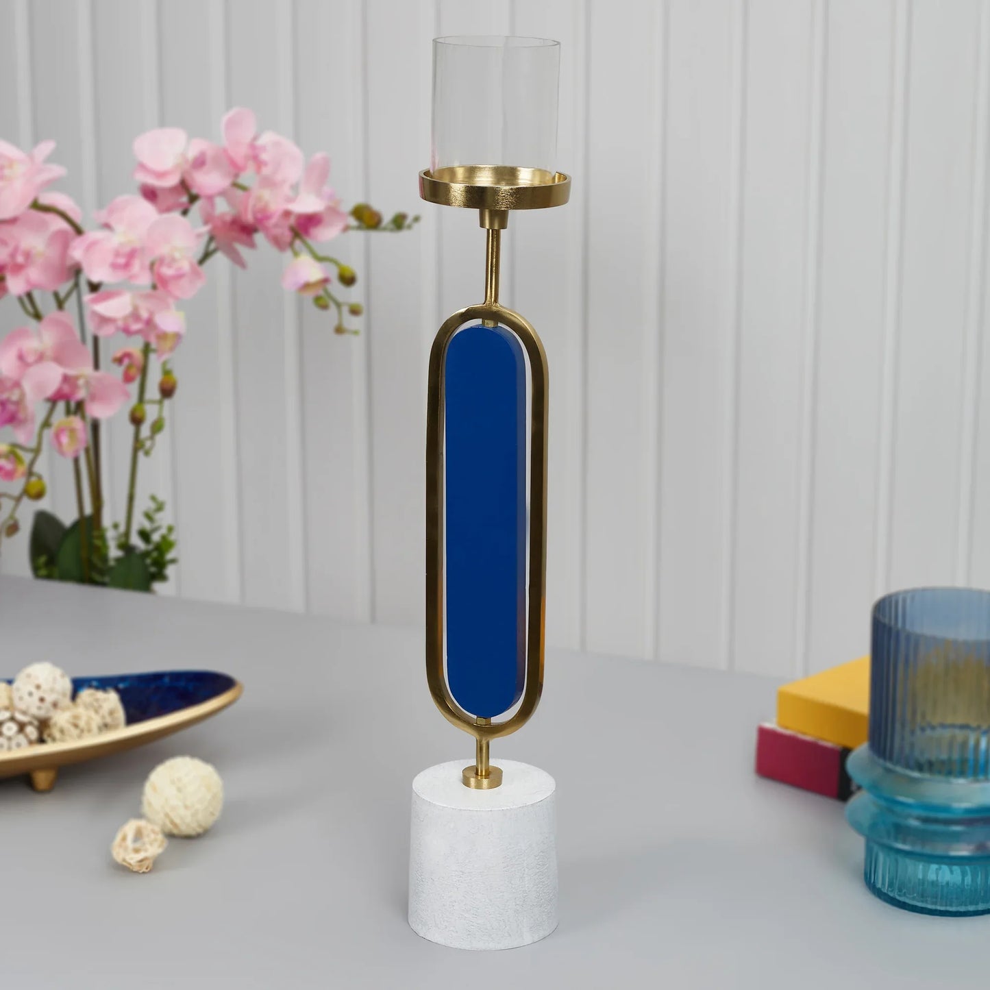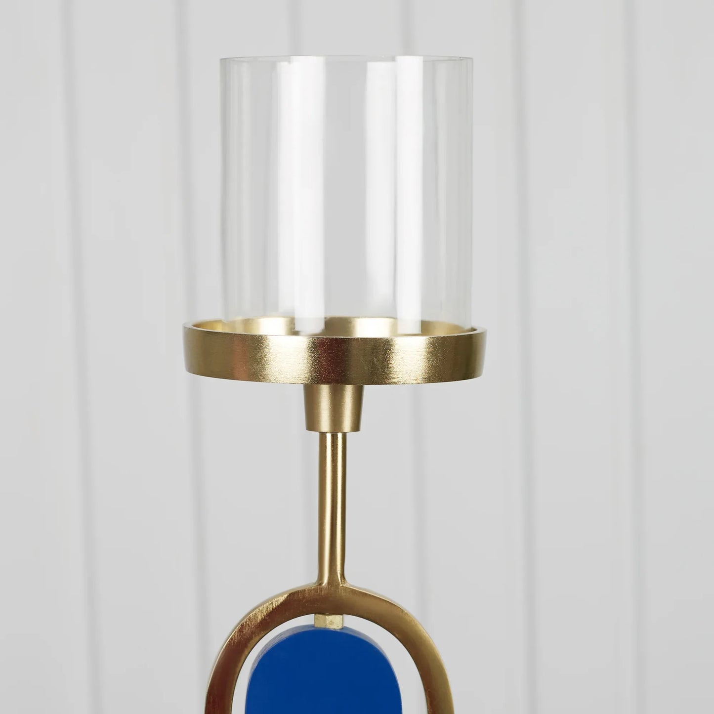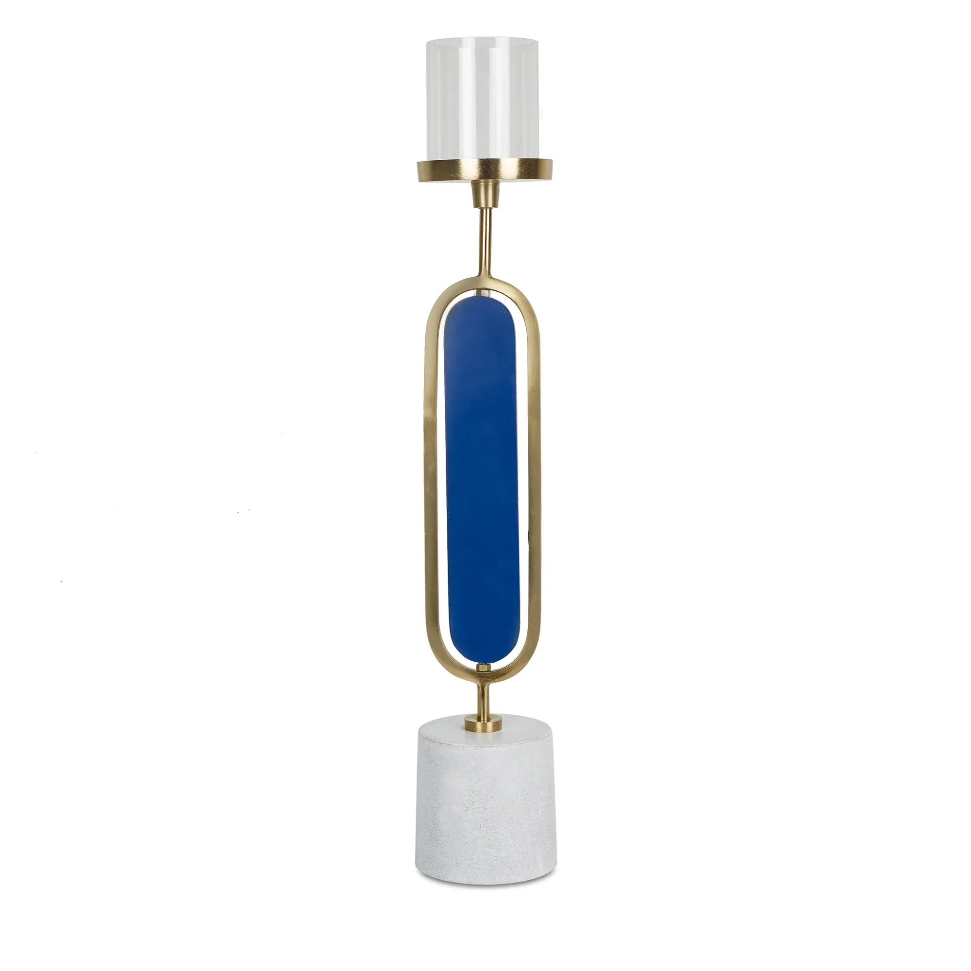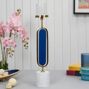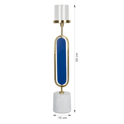 Athena Wood, Metal and Glass Oval Candle Holder 10x50 Cm in Navy Blue Colour