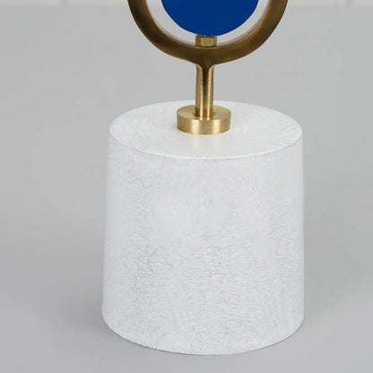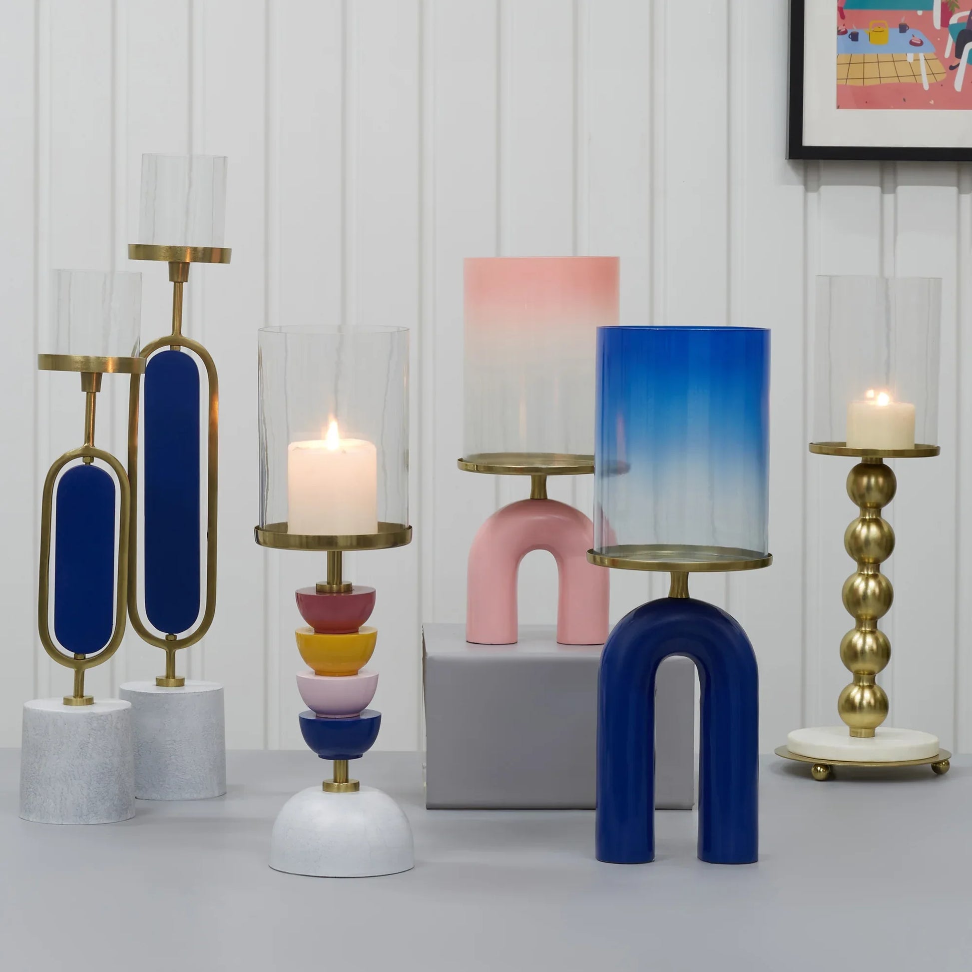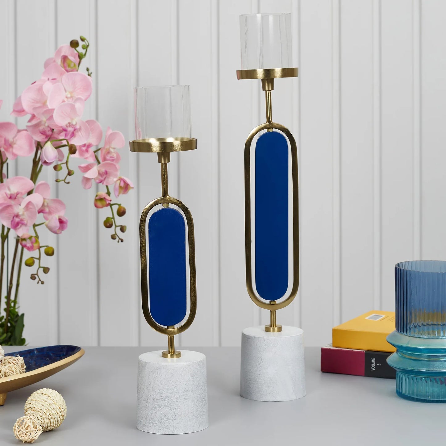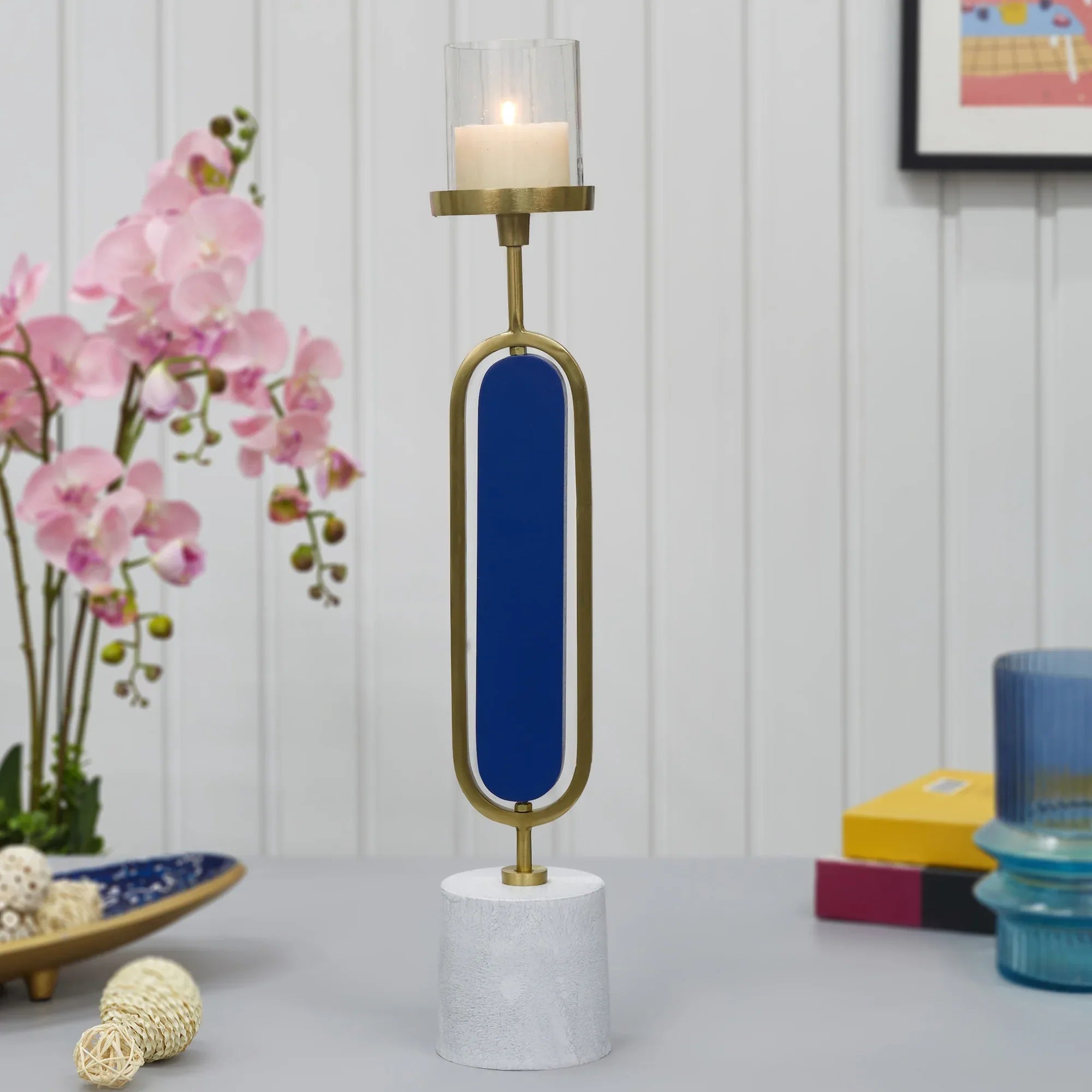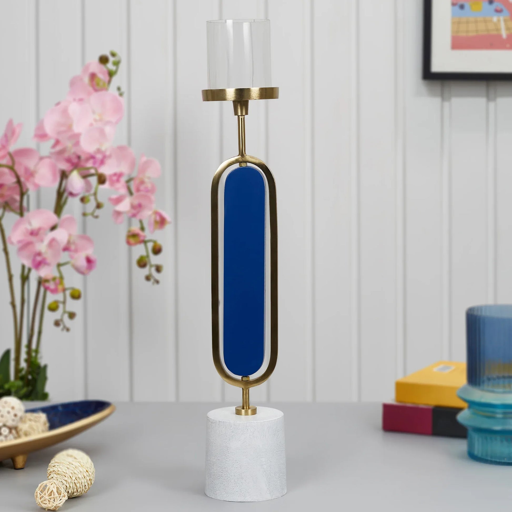 Athena Wood, Metal and Glass Oval Candle Holder 10x50 Cm in Navy Blue Colour