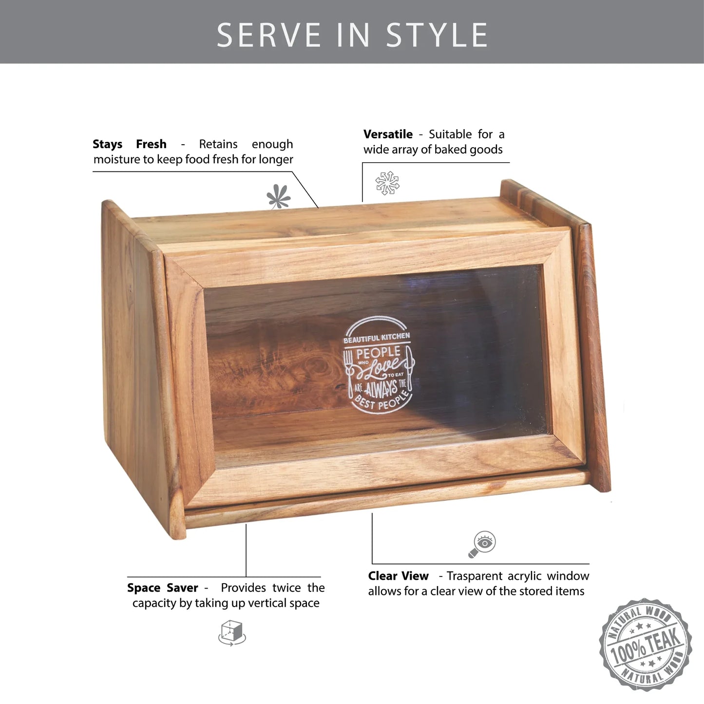 - Smart Design: Store and display bread and pastries inside this sturdy teak wood kitchen countertop bread holder; its chic style will complement any space.