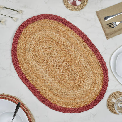 - Meticulously handcrafted, this dual colored placemat is apt to create an organic, natural and eco-friendly table setting that exudes a sense of style. It layers easily with any dinnerware, from casual to fancy and is a breeze to wipe or clean. Hand-woven by our Indian artisans with natural jute, this beautiful and versatile rounded placemat uses a tight weave to ensure durability. Our multipurpose table linen collection can also be used as decor accents to add a rustic charm to your home with natural fibers.