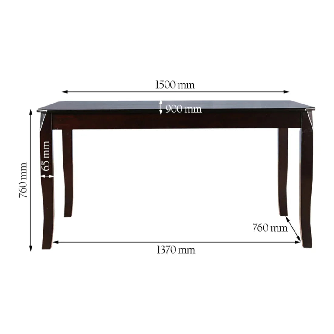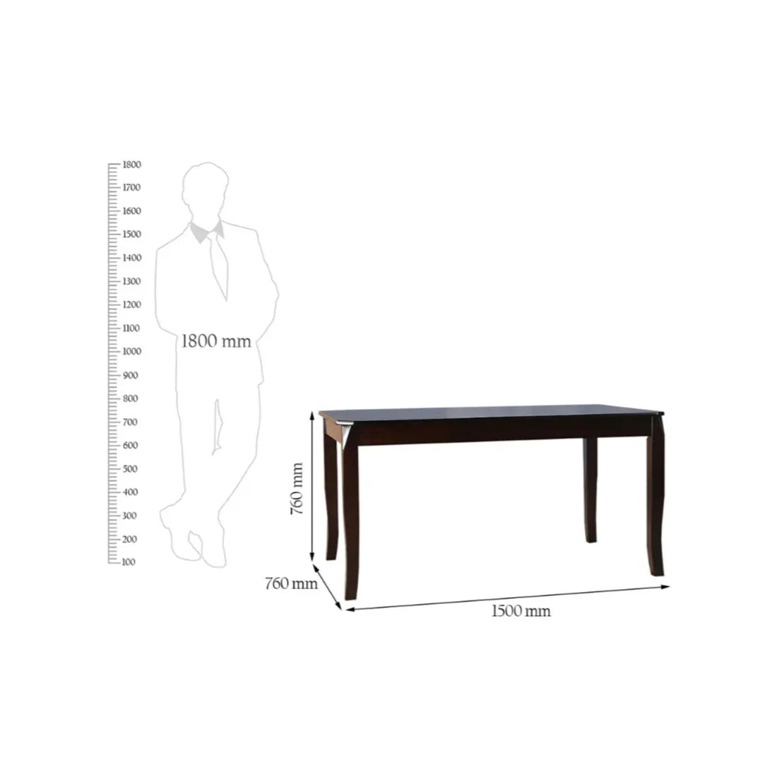 - Rectangular shape table top is made of 18 MM thick veneered engineered wood for a smooth look & appeal. This 1.5 mtr length dining table has an apron of 90 mm with moulded edge corners.