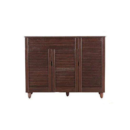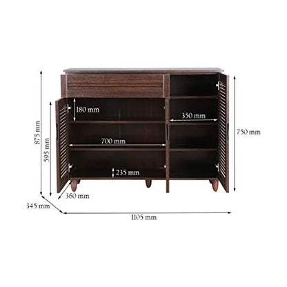 The three door Carry shoe rack, is contemporary in its design with utility maximization in its function. French louvres shutters amp up the design detail of the wenge shoe rack while offering ventilation for your shoes, allowing them to be fresh and odour free all the time. Use the top of the shoe rack as a quick access storage, styling it with bowls or decor it up with your favourite vases, etc. The modern leg detail gives the shoe rack its unique look and style.
