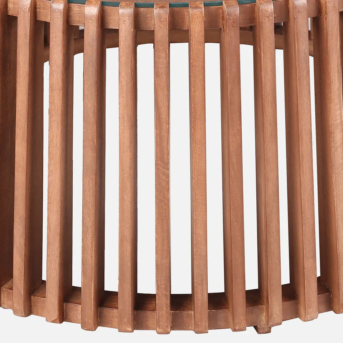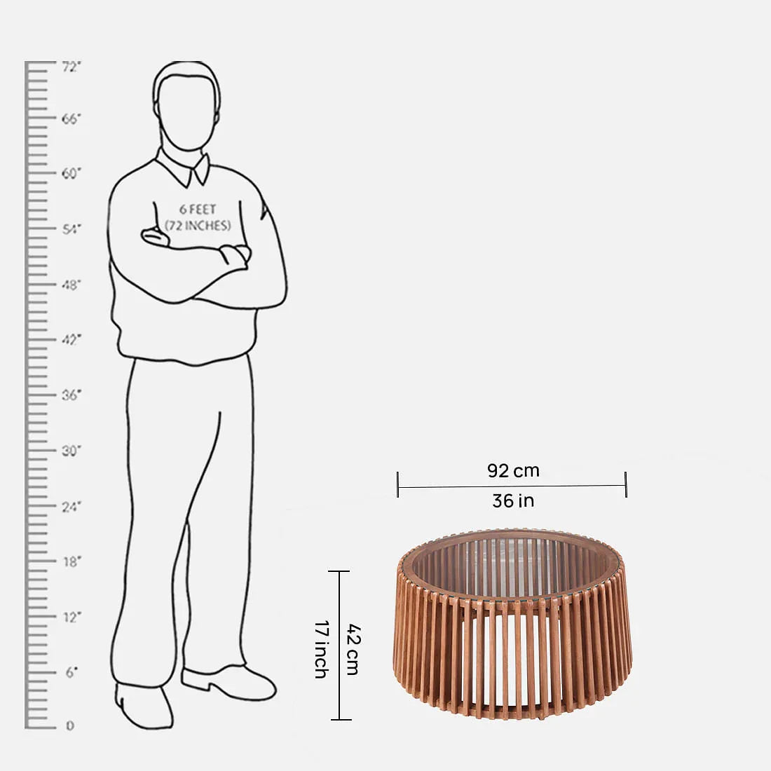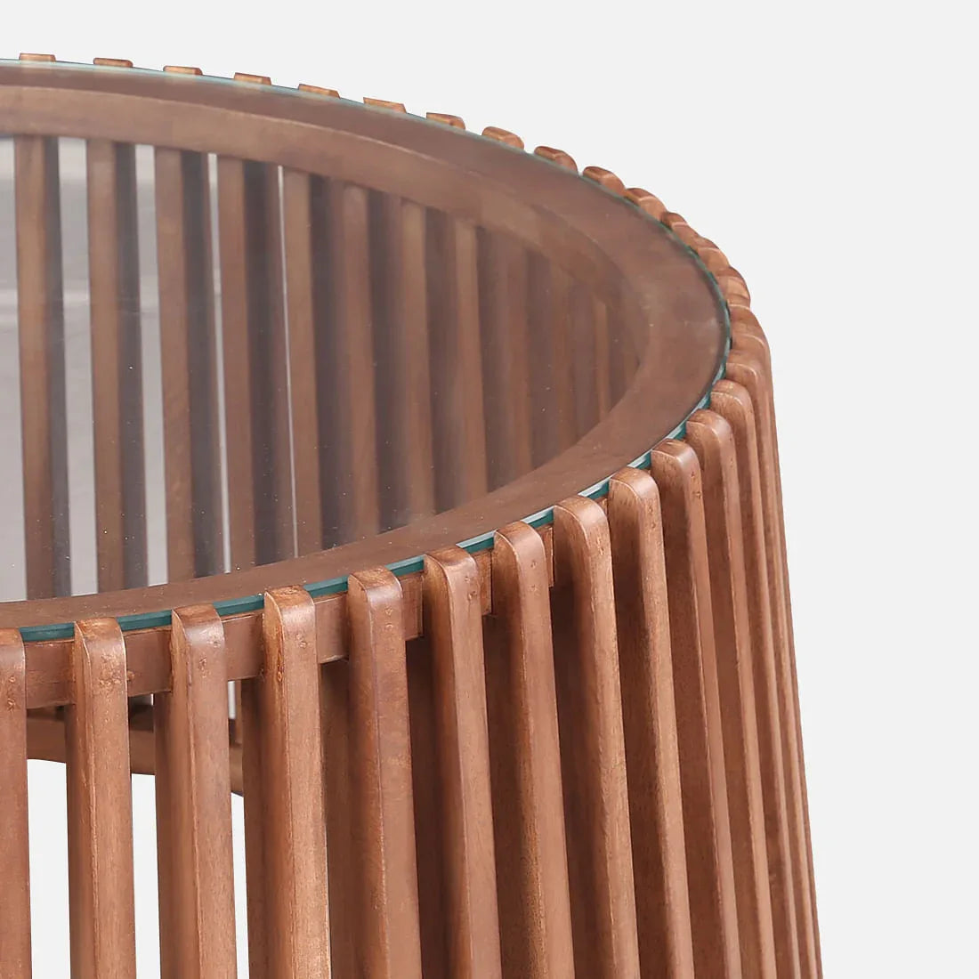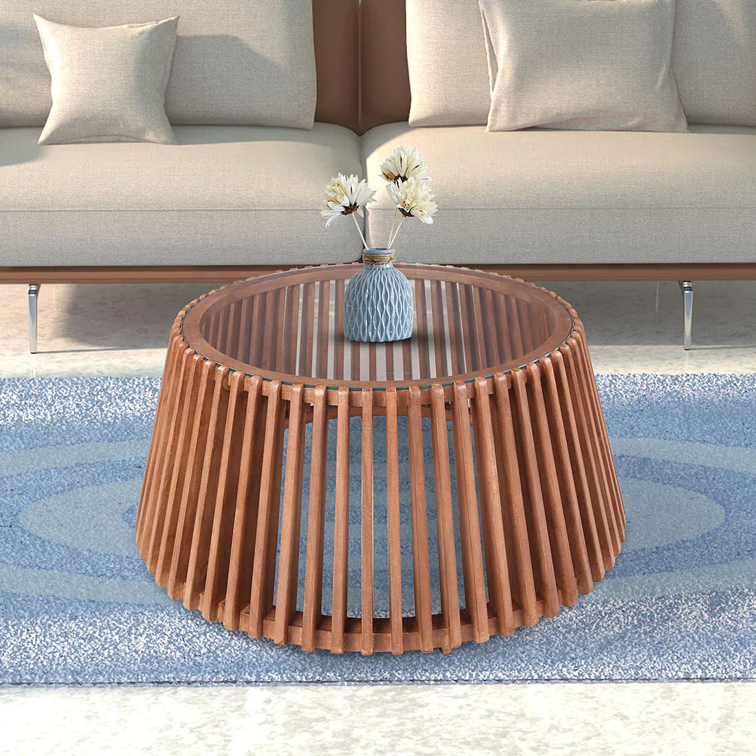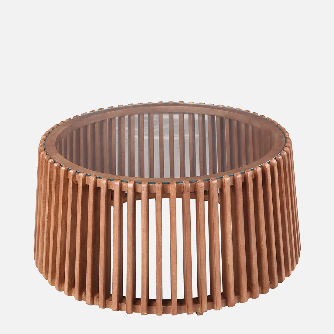 The Haku Center Table is made with a mix of natural materials, including a sturdy glass top and a solid wood panel in a walnut hue.