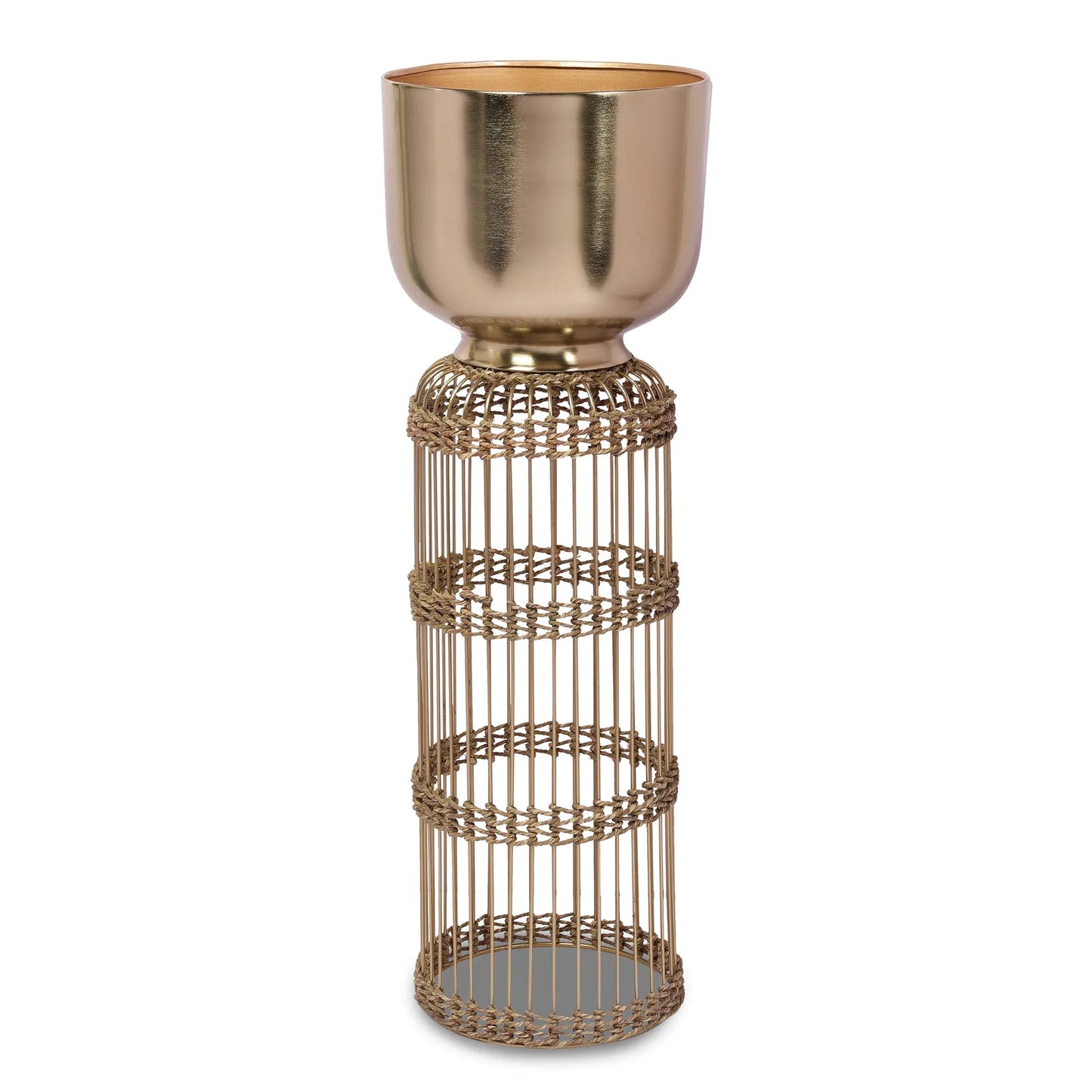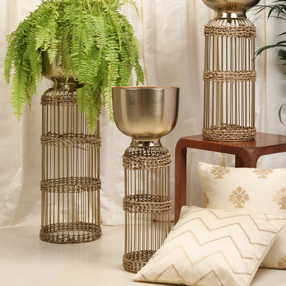 - Elevate your décor with our stunning floor metal planters. It is the perfect blend of elegance and durability, designed to showcase your favorite plants in style. Crafted from high-quality iron and rivergrass, it promises to be a long-lasting addition to your home.