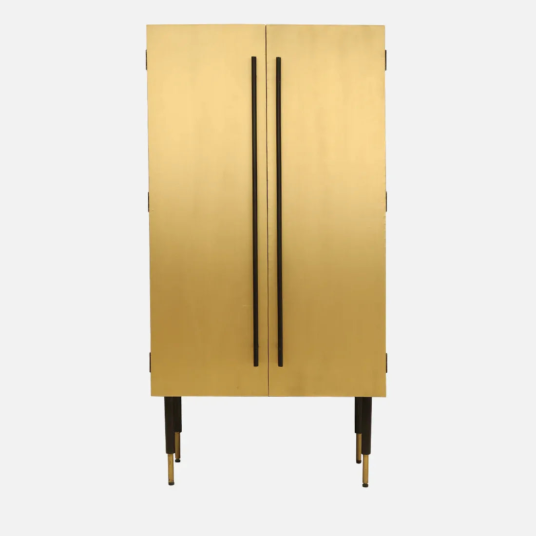- With the Crest Bar Cabinet, indulgence and style intertwine seamlessly, making it a captivating centerpiece in the realm of fine furnishings. Within its sleek silhouette lies a testament to luxury, adorned with meticulously handcrafted artisanal Brass cladding gracing its door panels. This exquisite detail exudes an aura of unparalleled sophistication, elevating the ambiance of any space.