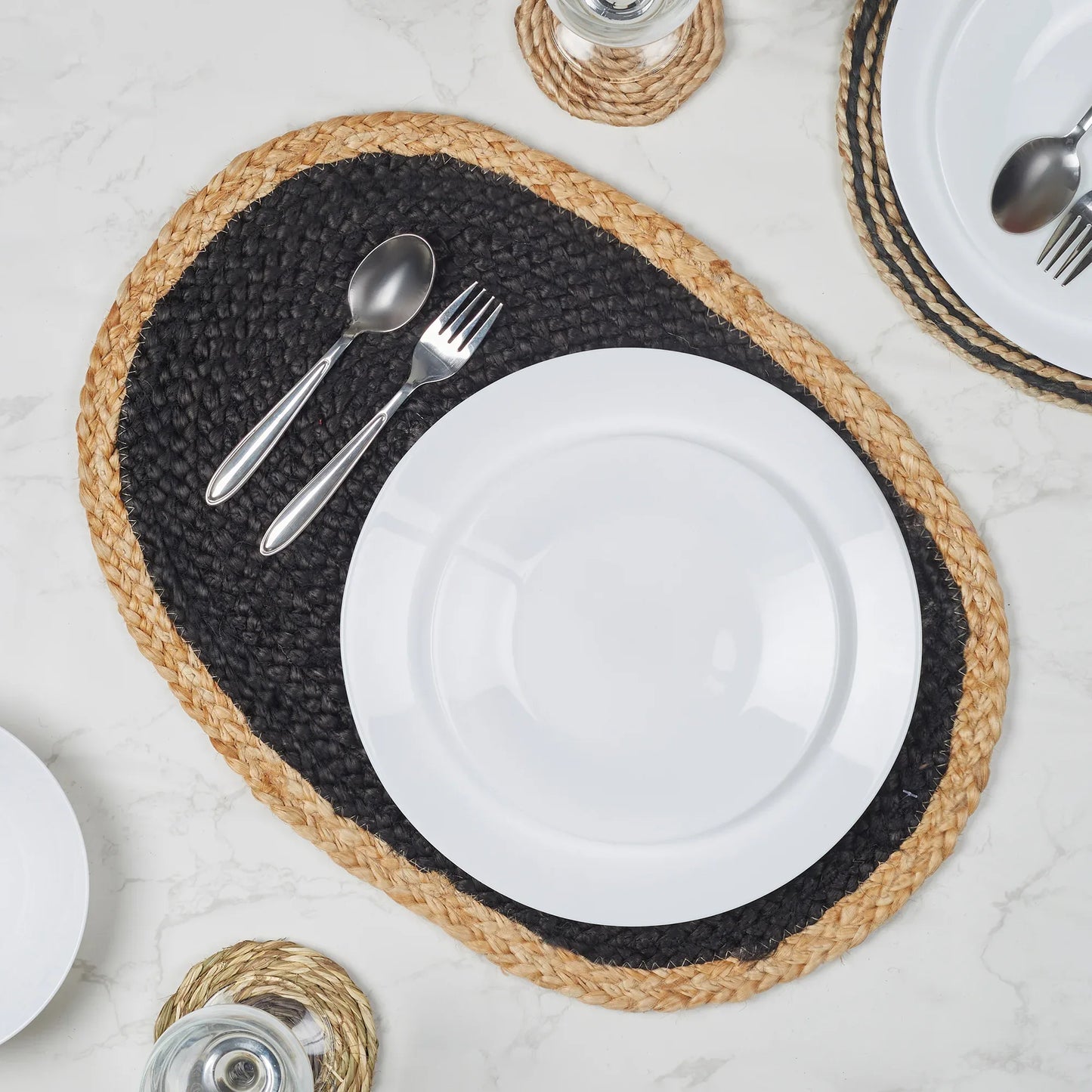 - Meticulously handcrafted, this dual colored placemat is apt to create an organic, natural and eco-friendly table setting that exudes a sense of style. It layers easily with any dinnerware, from casual to fancy and is a breeze to wipe or clean. Hand-woven by our Indian artisans with natural jute, this beautiful and versatile rounded placemat uses a tight weave to ensure durability. Our multipurpose table linen collection can also be used as decor accents to add a rustic charm to your home with natural fibers.