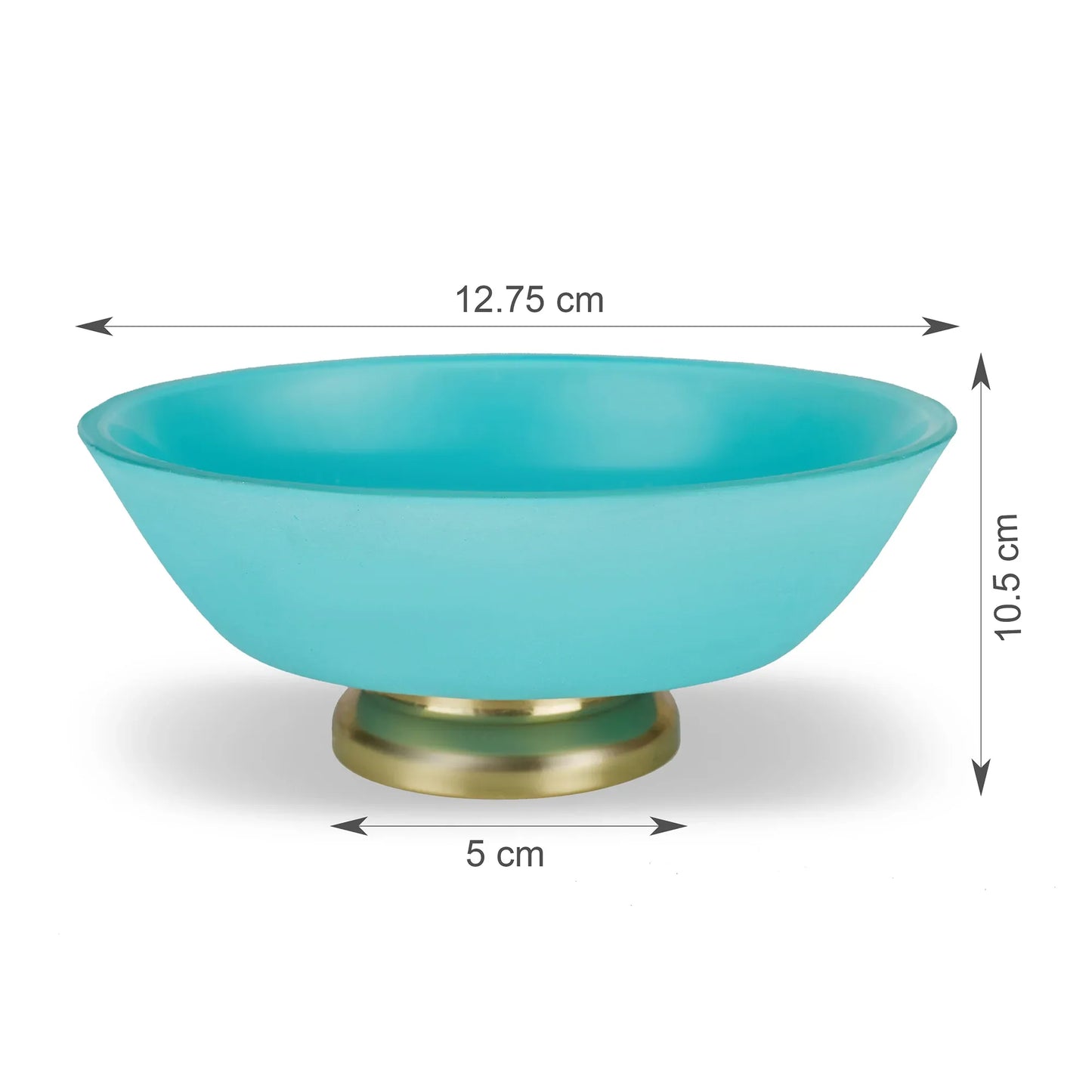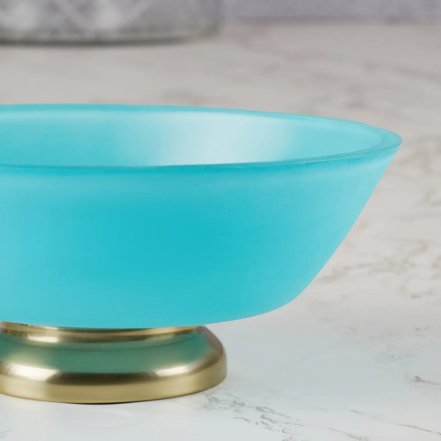 - The Emilia soap dish in turquoise frosted glass exudes modern aesthetics with solid colour overage and golden rim.