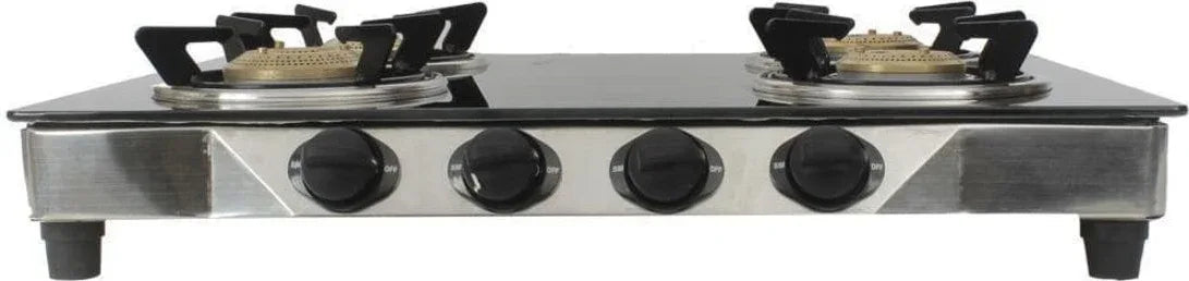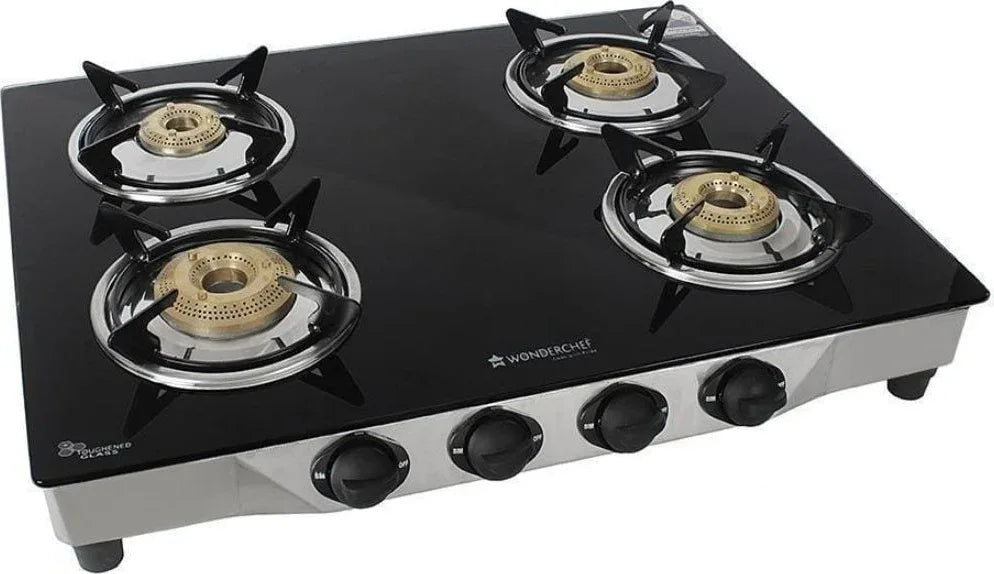 Energy Brass Burners, Toughened Glasstop, Stainless Steel Rings Cooktop 4 Burner in Black Colour by Wonderchef
