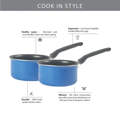 - Bring home the efficient, versatile & attractive Fiesta non-stick cookware set in fashionable cobalt colour. Induction compatible with 2.4mm thick body and 3-layer non-stick coating, this set is best in its line & a fine addition to your kitchen collection.