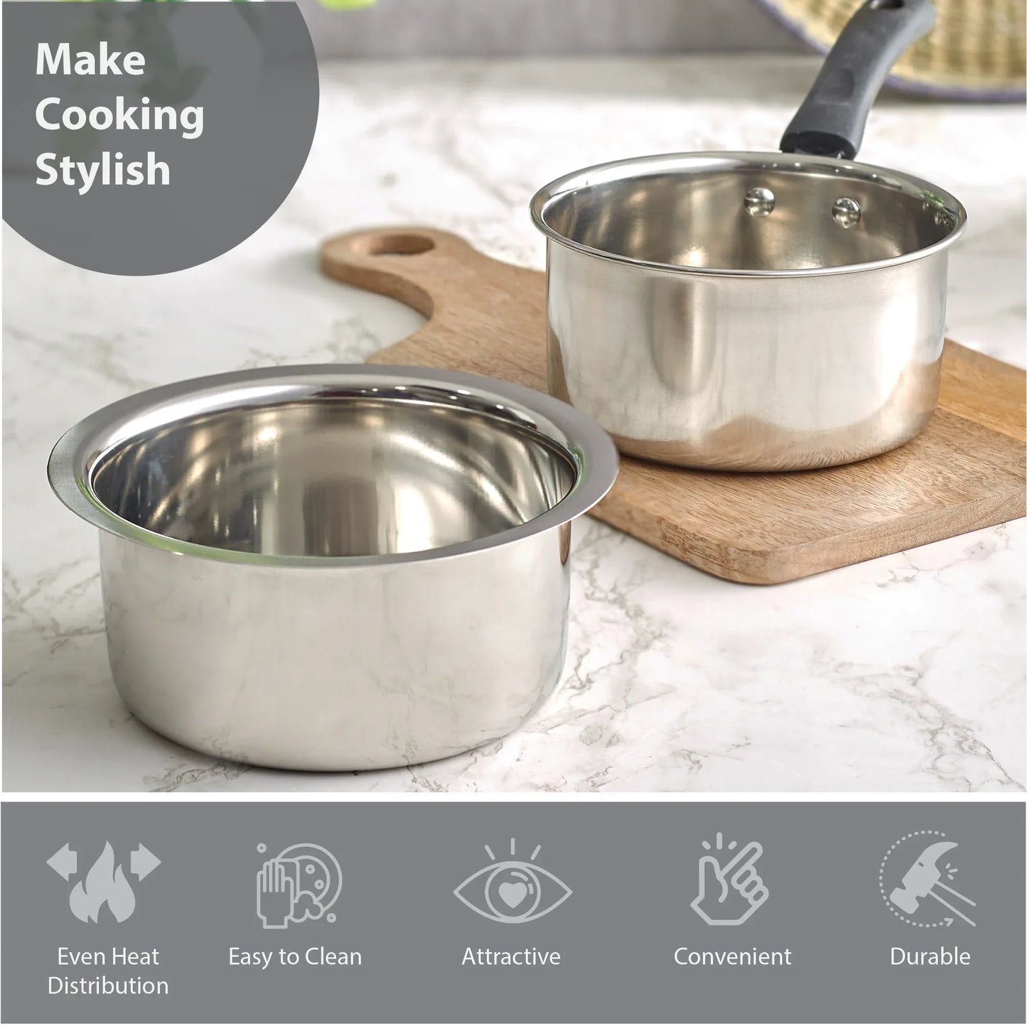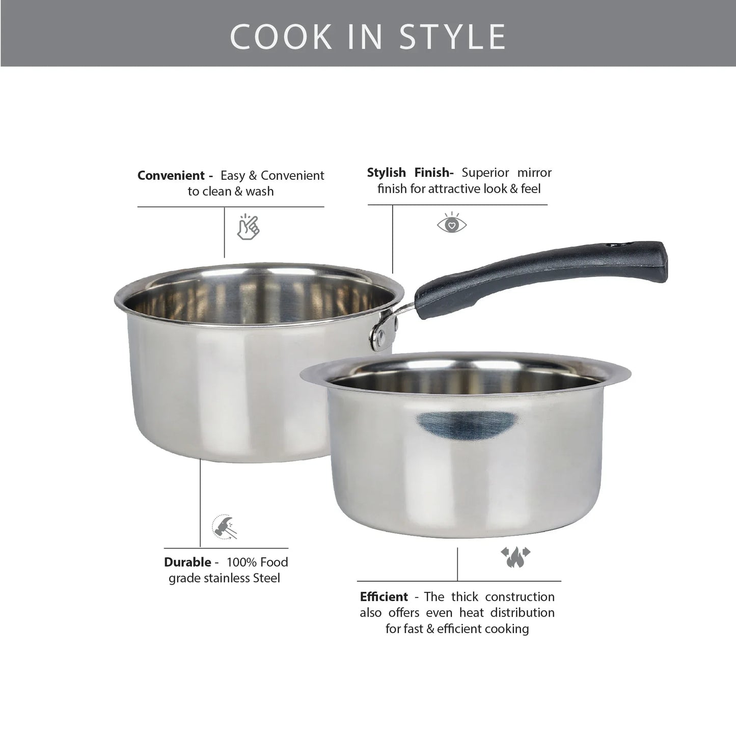 - This stainless steel sauce pan and tope combo is the ideal kitchen solution for making tea, coffee, soup, sauces, for boiling milk or water, for cooking pasta or noodles & even for re-heating food.