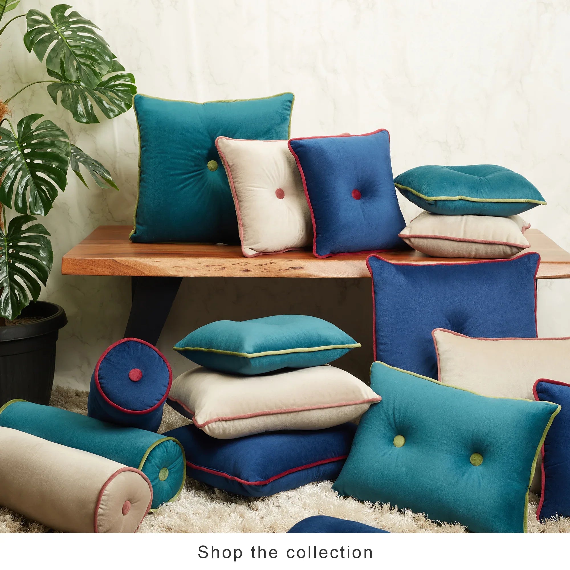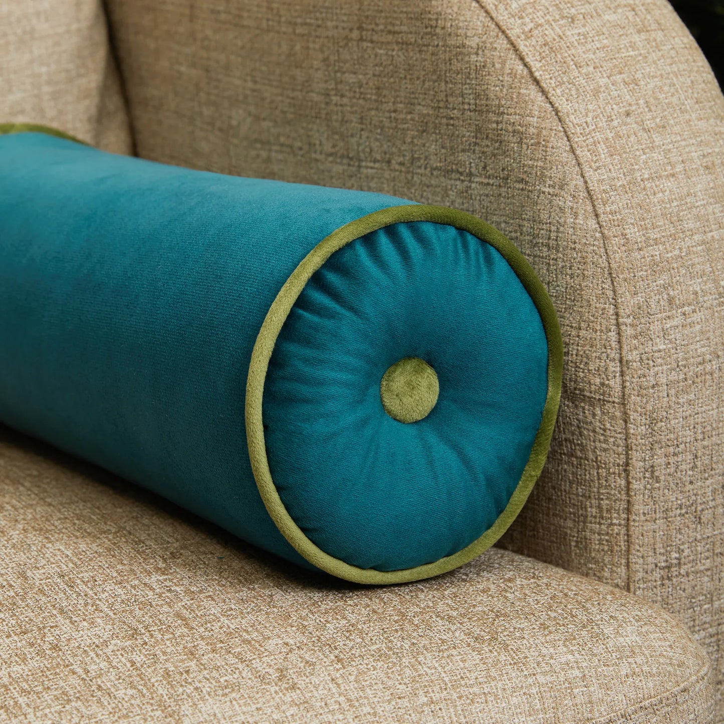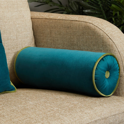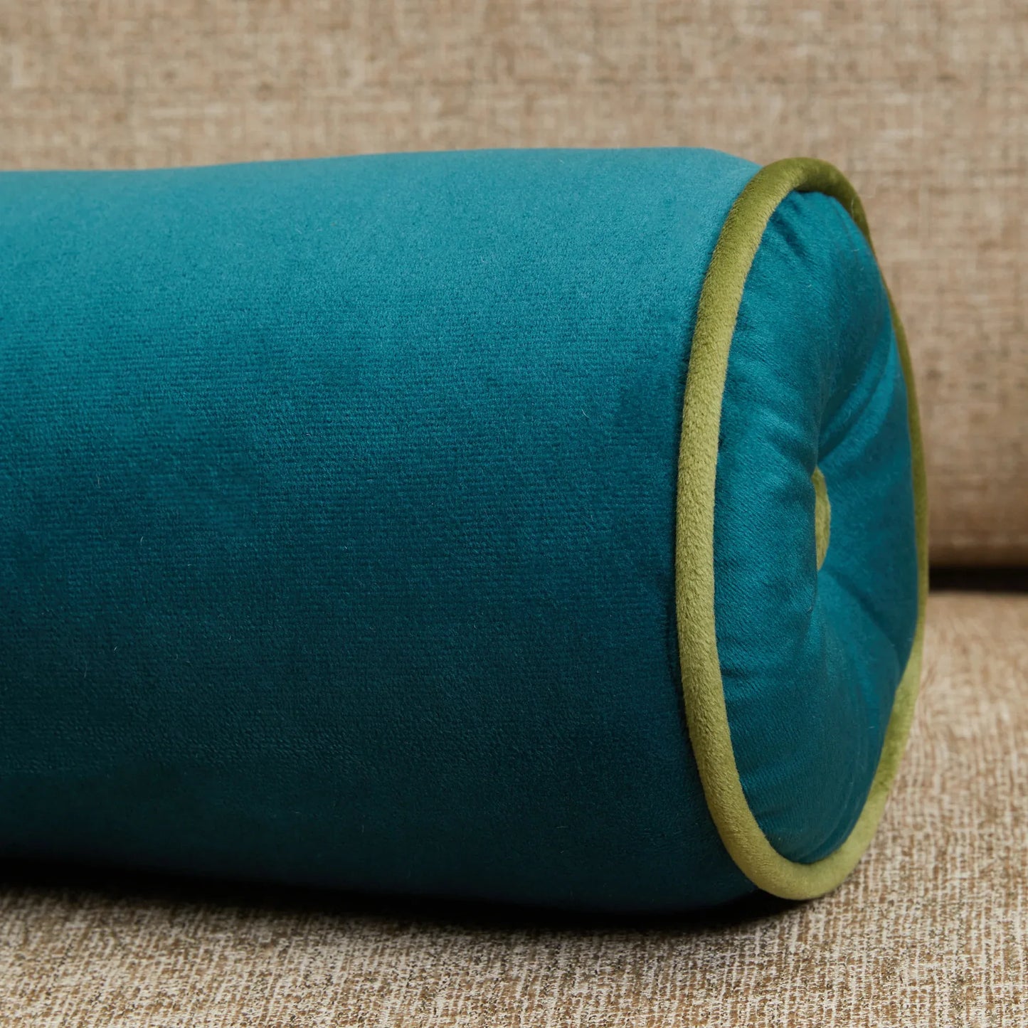 - Indulge in plush comfort and decor with our Fiesta velvet accent bolster cushions. The solid teal cushion with contrasting button tufts and piping elevate your spaces by making or breaking the theme of your space. The filled reversible cushion is multipurpose in nature; easily placed in spaces like your living room, study, bedroom, cars, etc.