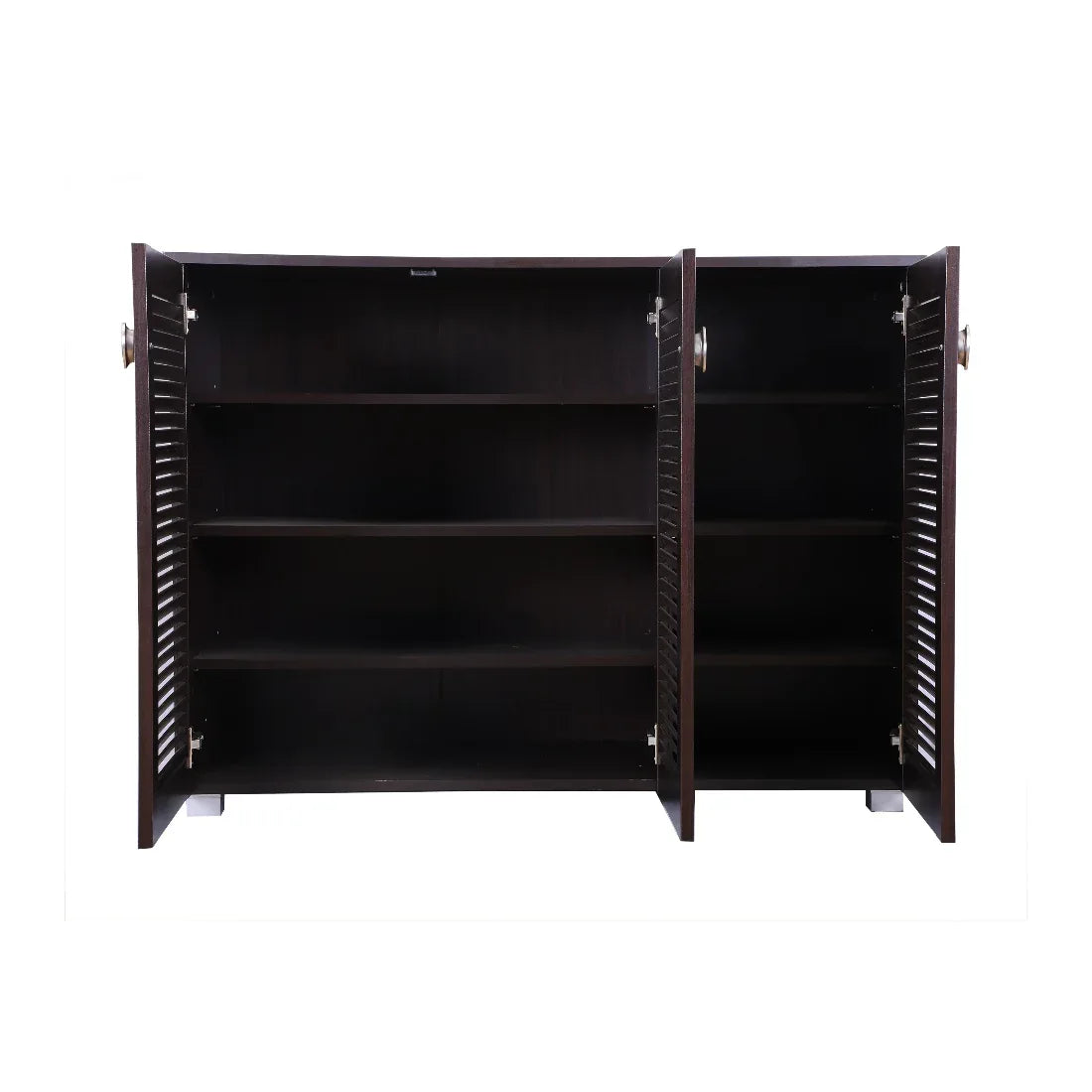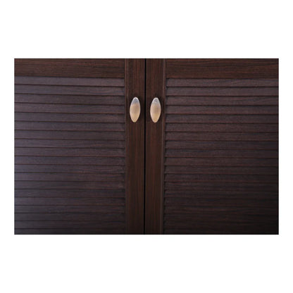 Classic in its constructions, the Frisco shoe rack offers well ventilated shelves for your footwear keeping them healthy and fresh. The wenge shoe rack finished with natural wood grain texture has rounded metallic knobs to the doors with French louvre shutters elevating the design style quotient of the unit. Style it with statement decor pieces on the top shelf or wall art along with it.