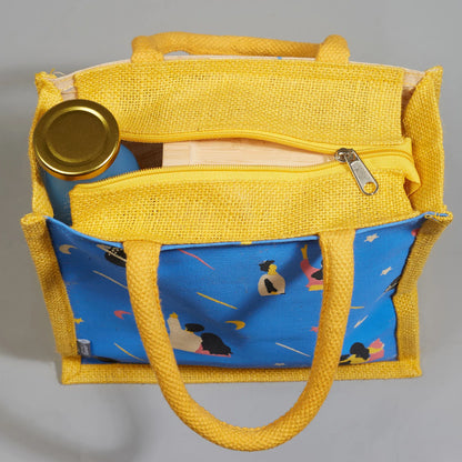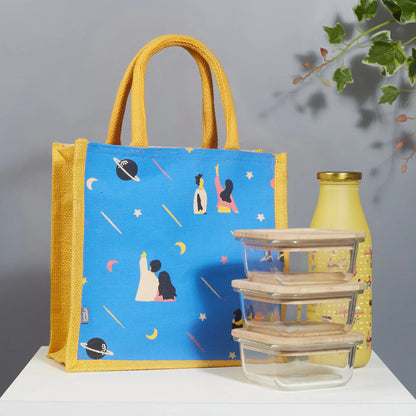 Good Life Jute Reversible Stary Night Printed Lunch Bag 25.5 x 25.5 Cm in Navy Blue & Yellow Colour