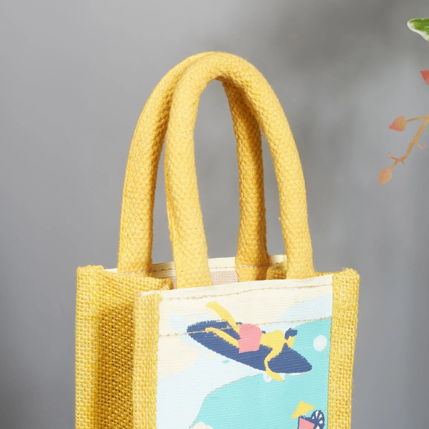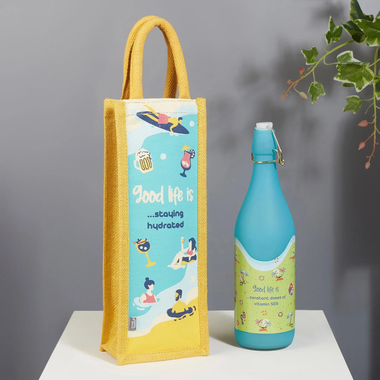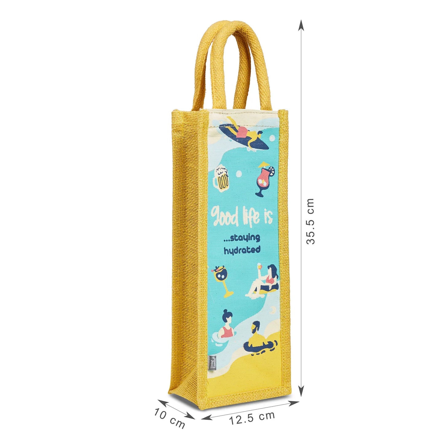 - An everyday essential, this multi-purpose bottle bag is ideal for carrying your Water, Jiuce, wine bottle. These bags are made from the finest quality zuco fabric (jute+cotton) which is eco-friendly, biodegradable and recyclable. With vibrant prints made with high quality durable dyes, the bag features illustrations from our Good Life Is collection that celebrates happy memories from everyday living. It can be used as packaging for gifting and is also a gift in itself!