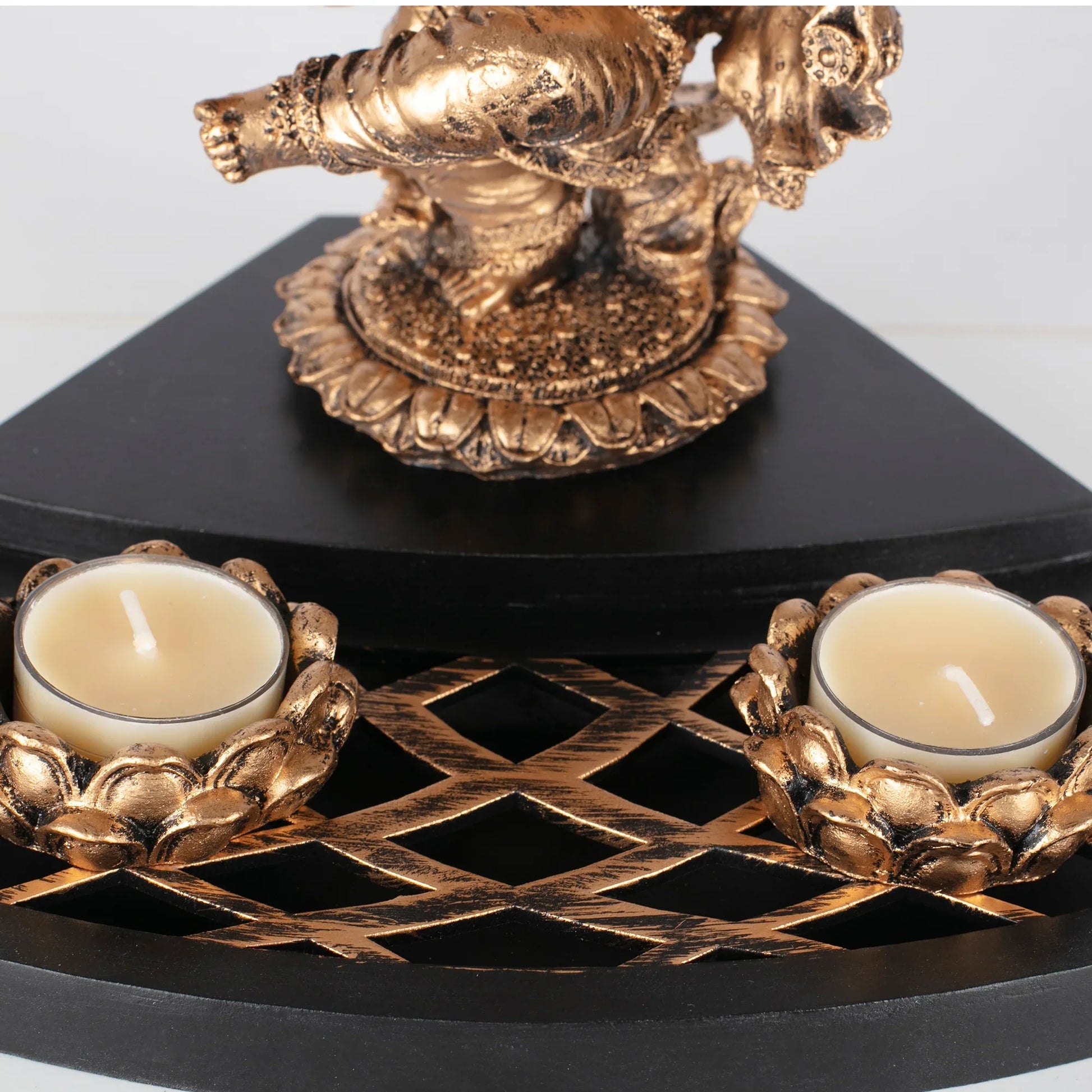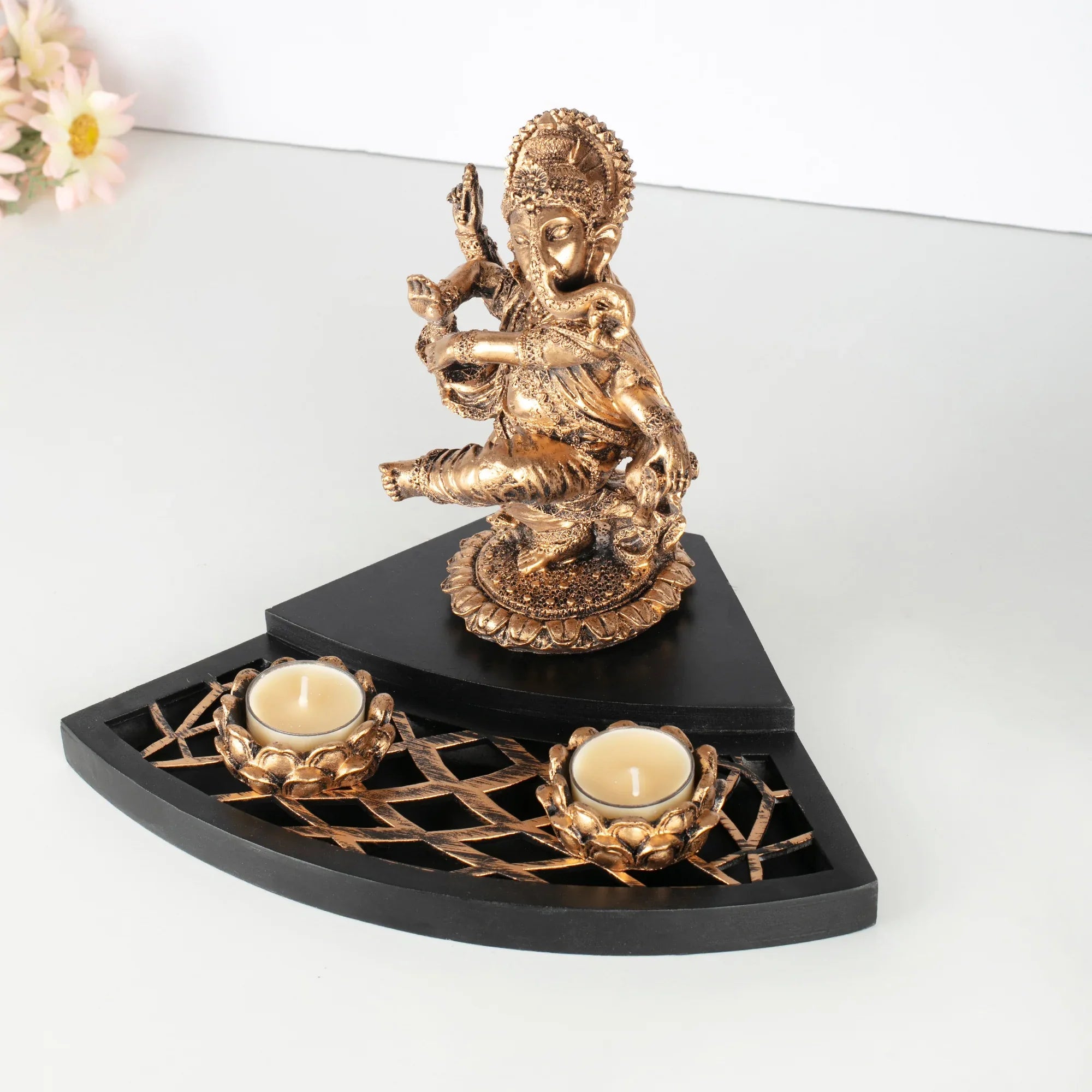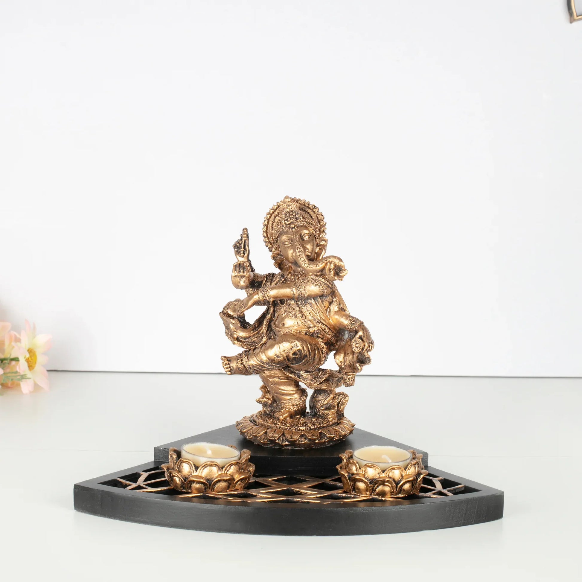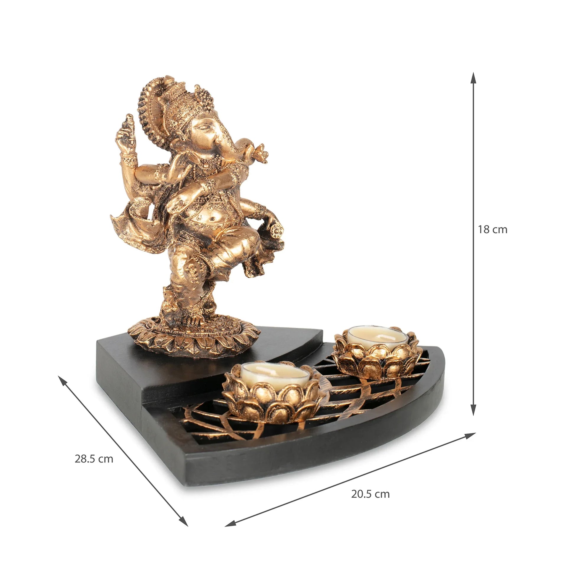 - A wondrous addition to your home, this Ganesha figurine cum t-light holder is exquisite. The base has a unique shape with a stylish design atop which the t-lights sit. When lit, they illuminate Ganesha in a magical sense, making him the centerpiece.