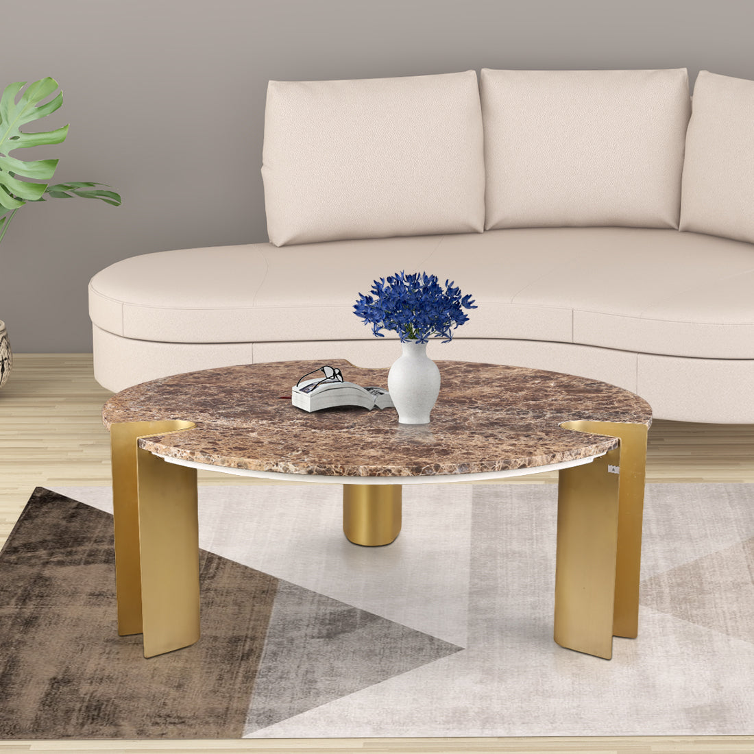 - The Grandex center table draws inspiration from the Plush Elegance design theme, aiming to bring a sense of luxury and opulence to any interior space. With its tall, elegantly curved golden metal legs and dark Emperador marble top, this center table exudes sophistication and refinement.