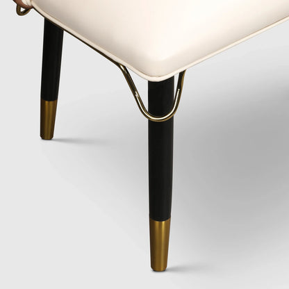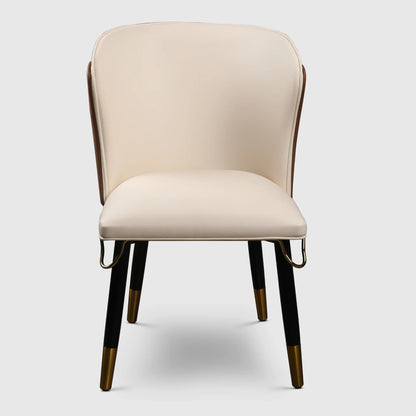 The Henry dining chair compliments the collectionâs statement dining table seamlessly adding to the already grandeur styling. Layered back with ample cushioning on the back and seat with premium beige upholstery, the chair offers a relaxed and comfortable experience. With durable legs coated in black and farmed by gold platted tip, the dining chair is a must have for all statement-makers.