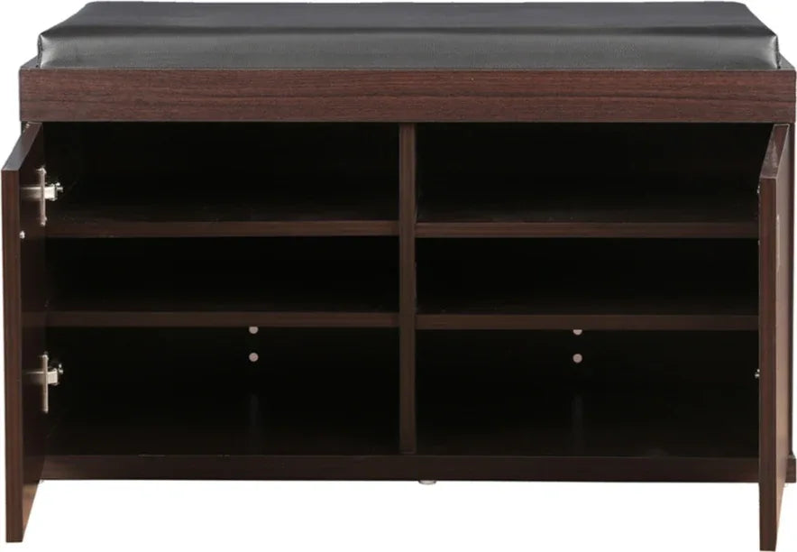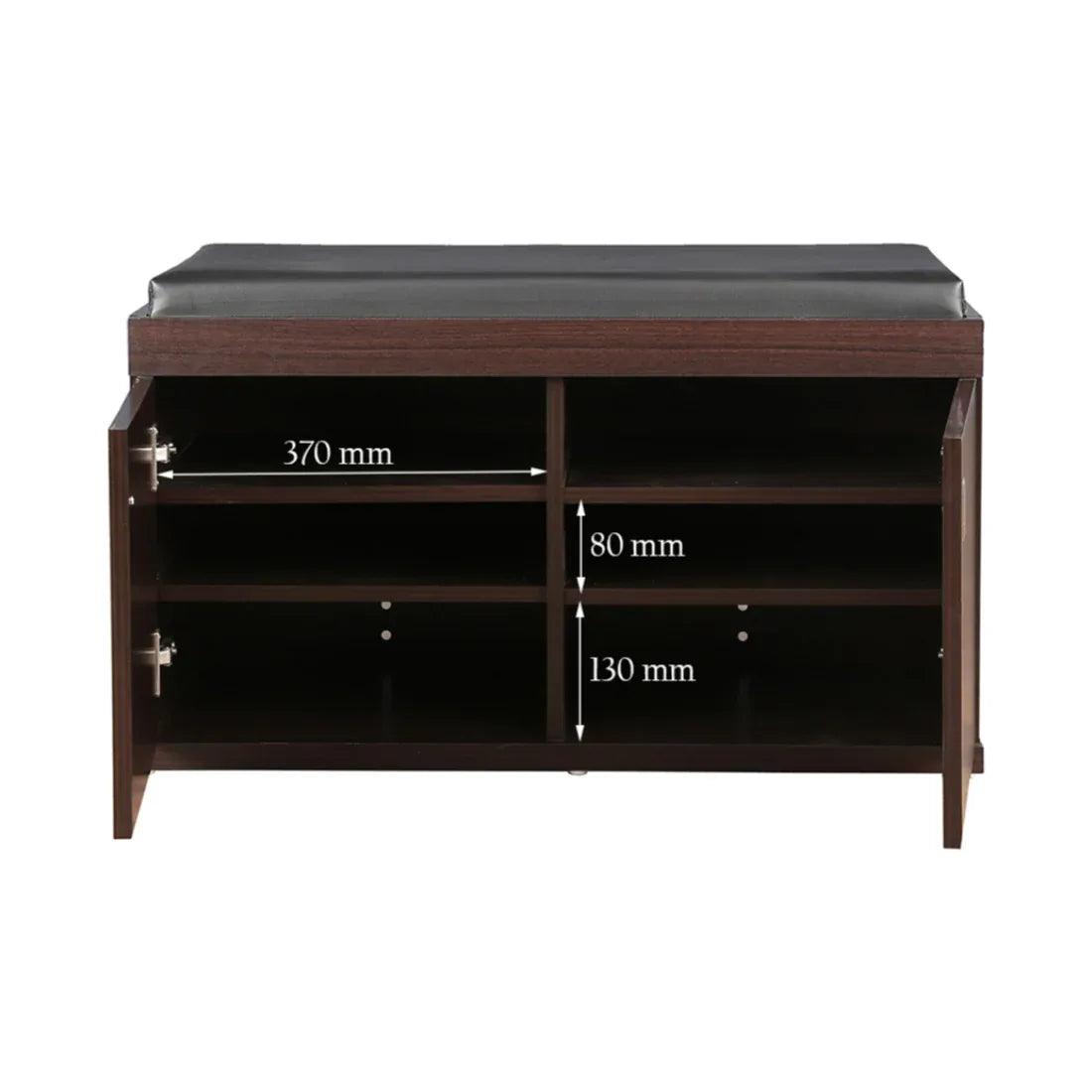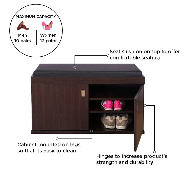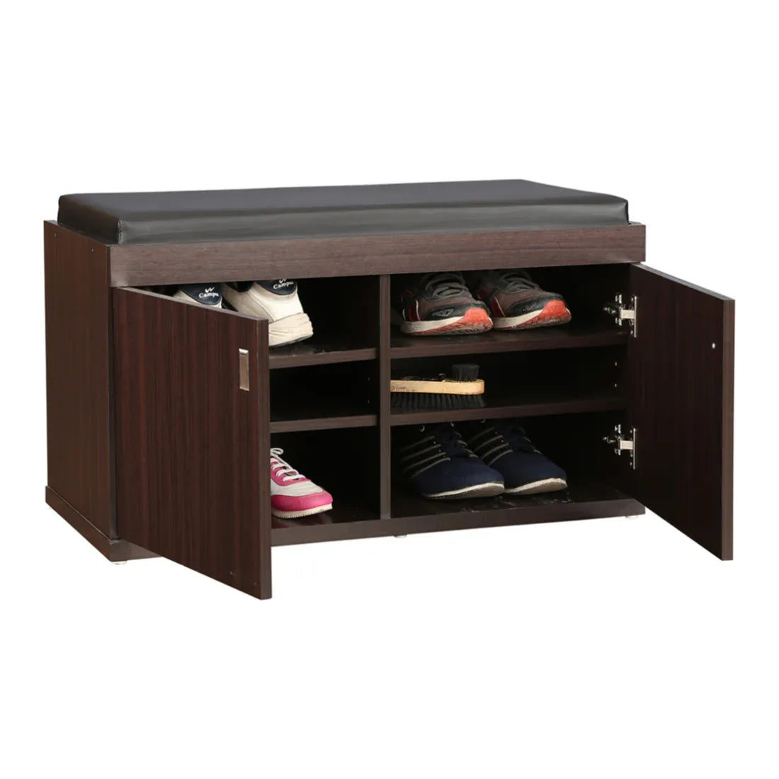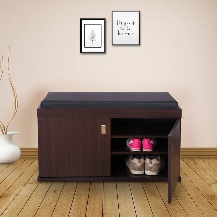 Best of form and function, the two door shoe rack modern in its walnut natural wood grain finish and sturdy form can accommodate up to 10-12 pairs for footwear. Cushioned seat on top make this shoe rack the perfect addition to your home for usability and practical function of sitting and either wearing or taking off ones shoes.