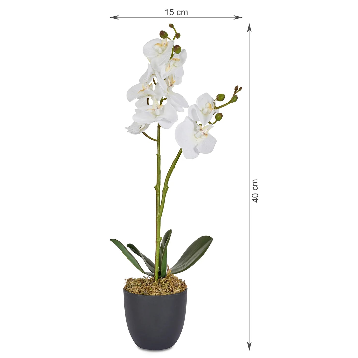 - This charming orchid features lifelike look. Made from high-quality plastic materials, these flowers will amaze your guests with their realistic touch and feel. Artificial florals are the perfect, low-maintenance solution to bringing the beauty of fresh flowers into your home -- no sunlight or watering required. Realistic faux flowers create a relaxing, welcoming atmosphere and brightens up any space