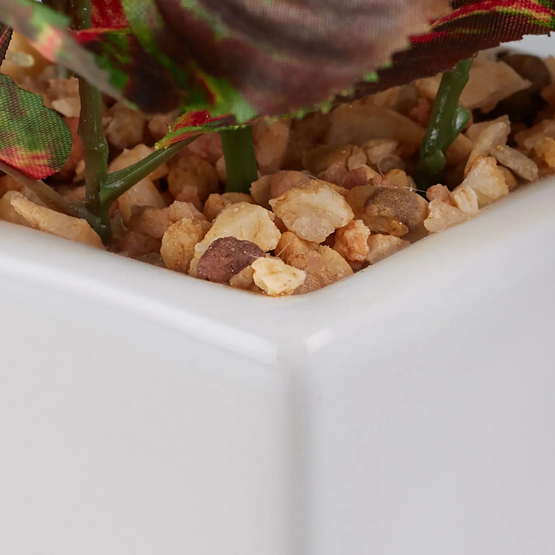 - This faux plant looks and feels as real as it can get, with its life-like texture. It is potted in a simple, white ceramic pot with lush pebbles on the surface, adding to the plants aesthetic appeal. The earthy green leaves are accompanied by red ones, mimicking the beginning of autumn. This plant is ideal if youre looking to add a sliver of nature to your home!