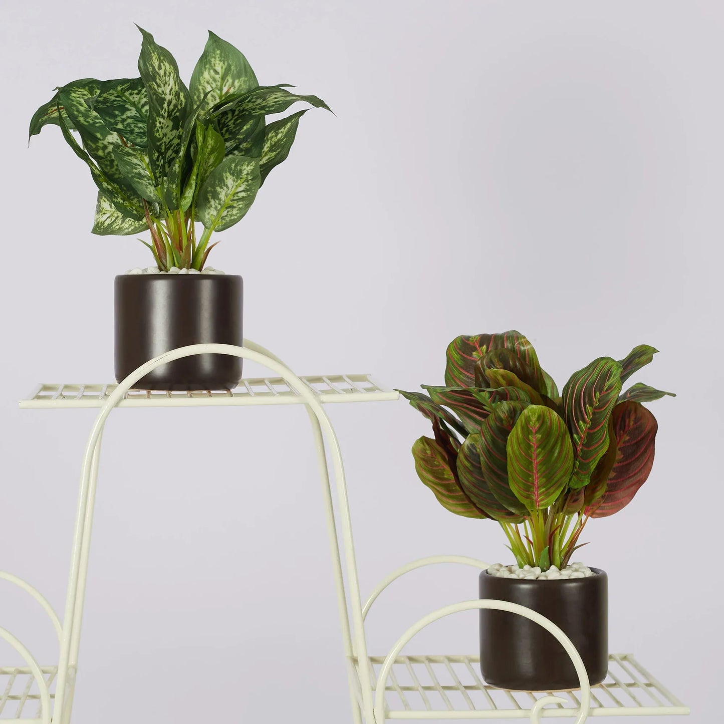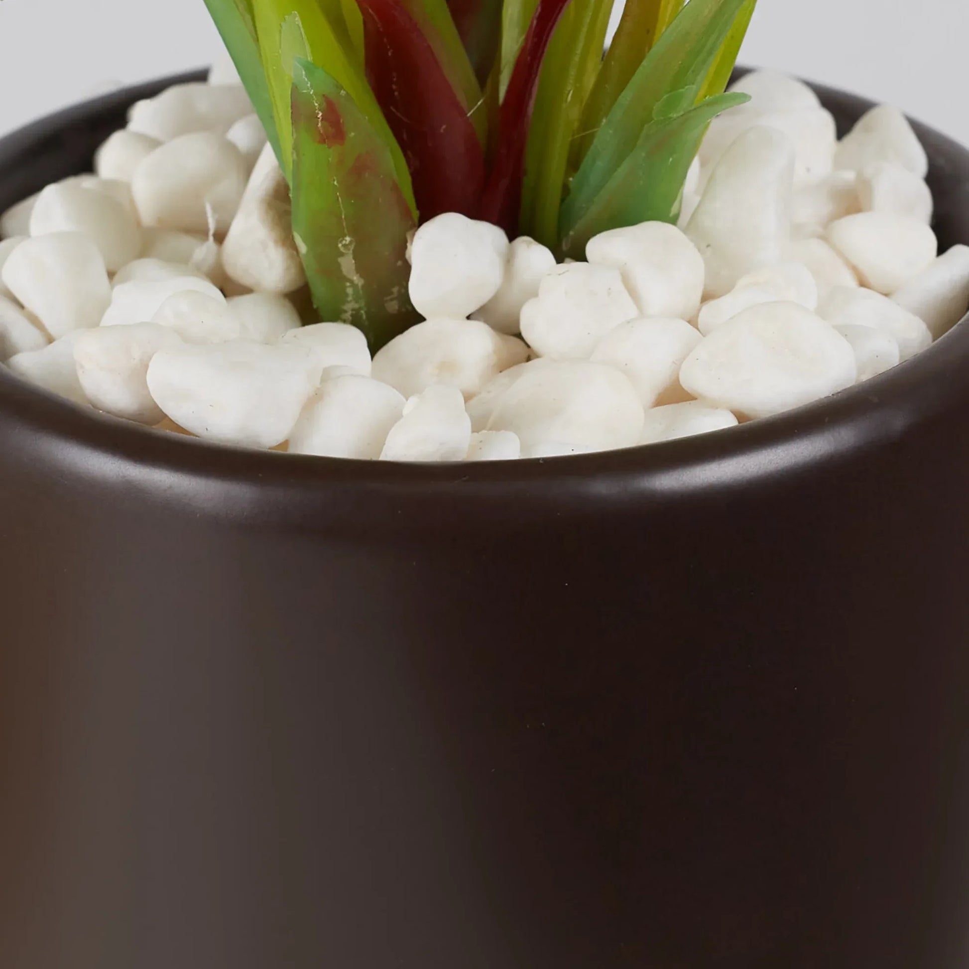- The eclectic range of leaves on this stunning faux plant surely impress. The lifelike texture leaves no room for speculation and will wow your guests with its natural appeal. The plant lays atop crunchy white pebbles and is encompassed within a ceramic, matte black pot.