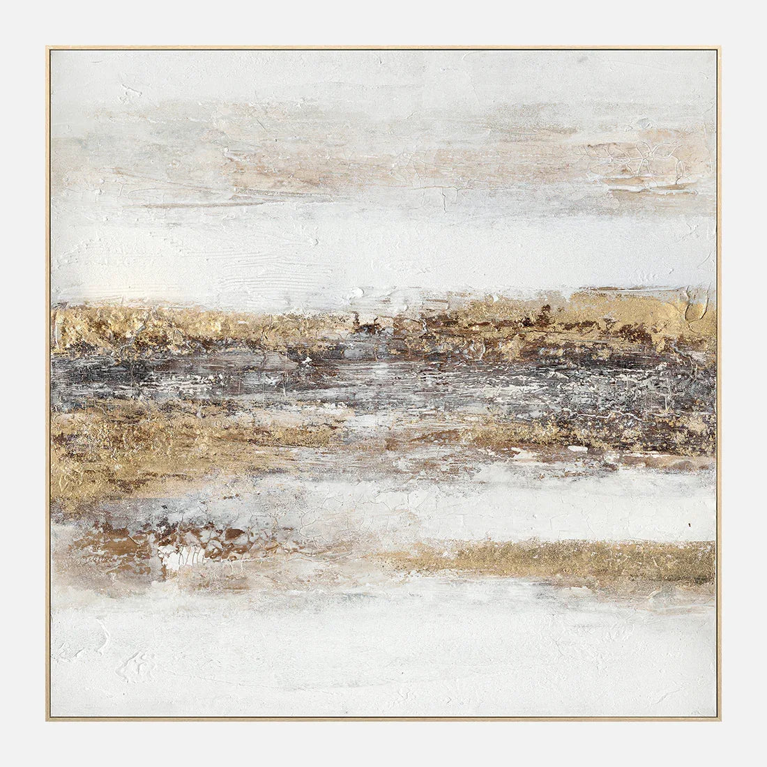 Add a touch of opulence to your home with our exquisite abstract shore-inspired canvas artwork. This stunning piece features a sophisticated and plush look, beautifully complemented by an elegant interplay of gold, silver, grey, and white tones. The metallic gold accents add a luxurious 3D texture, making it a true statement piece.