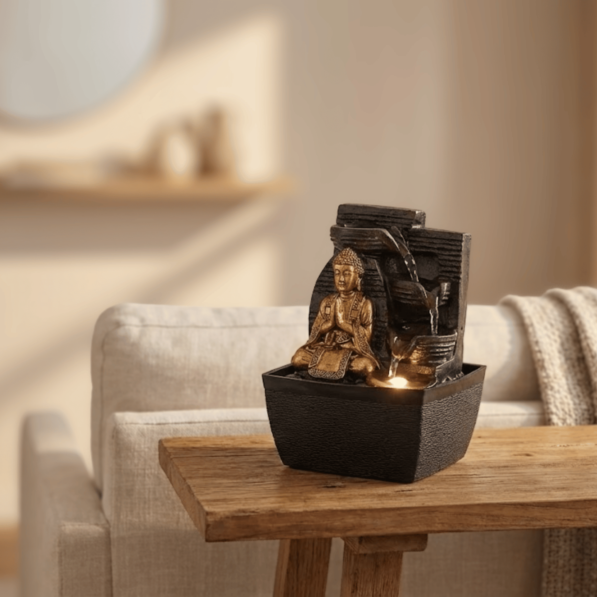 - Fill your indoor spaces with tranquillity and elegance by bringing a Resting Buddha Fountain to your space. A water body is known to soothe ones mind and soul. Two fold fountain rich in function and decor properties, is handcrafted by skilled artisans. Liven up your interiors with the help of this durable and long lasting fountain.