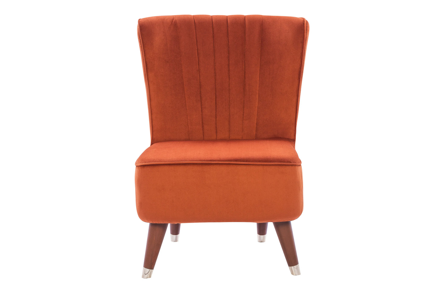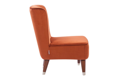 The Jane rust accent chair elevates the charm and ambience of your home. The stylish and eclectic accent chairs upholstered in soft velvet fits perfectly in all types of home. An accent chair for everyone, The Jane accent chair is soft and curved in its silhouette with arched back that hugs your back gently. The solid wood frame ensures the durability of the construction with golden tips on the legs to package the look into an elegant seating option.