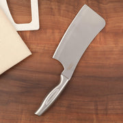 - Grab this giant chopping knife to cut your way through anything from heavy veggies to hard bones. Made using stainless steel, this knife flaunts a royal silver color, and its a must-have in your kitchenware pieces.