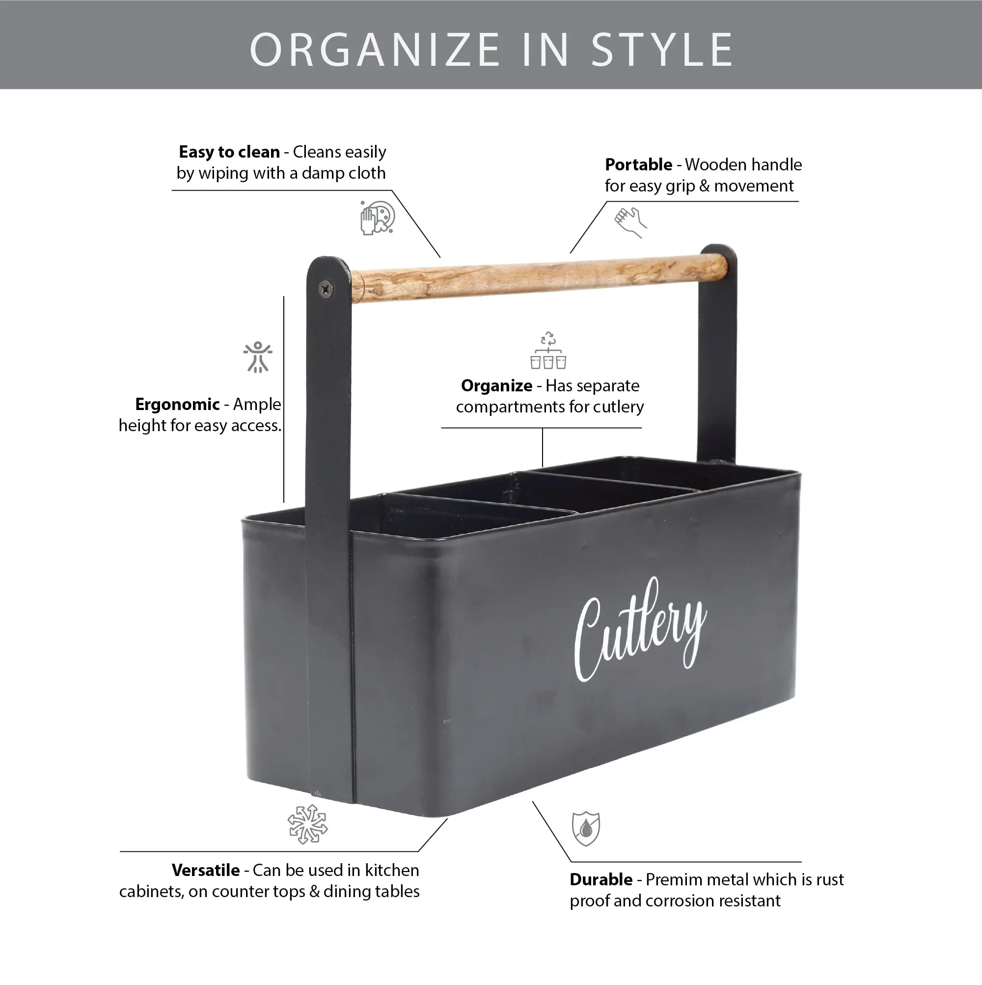 - Clutter Free Storage : Large utensil organizer provides plenty of room for all your cutlery, tissue papers, napkins, condiment jars & oil/sauce bottles - so you would not have to rummage through drawers searching for them. This product effectively helps to free up cabinet drawer space and keep countertops tidy.