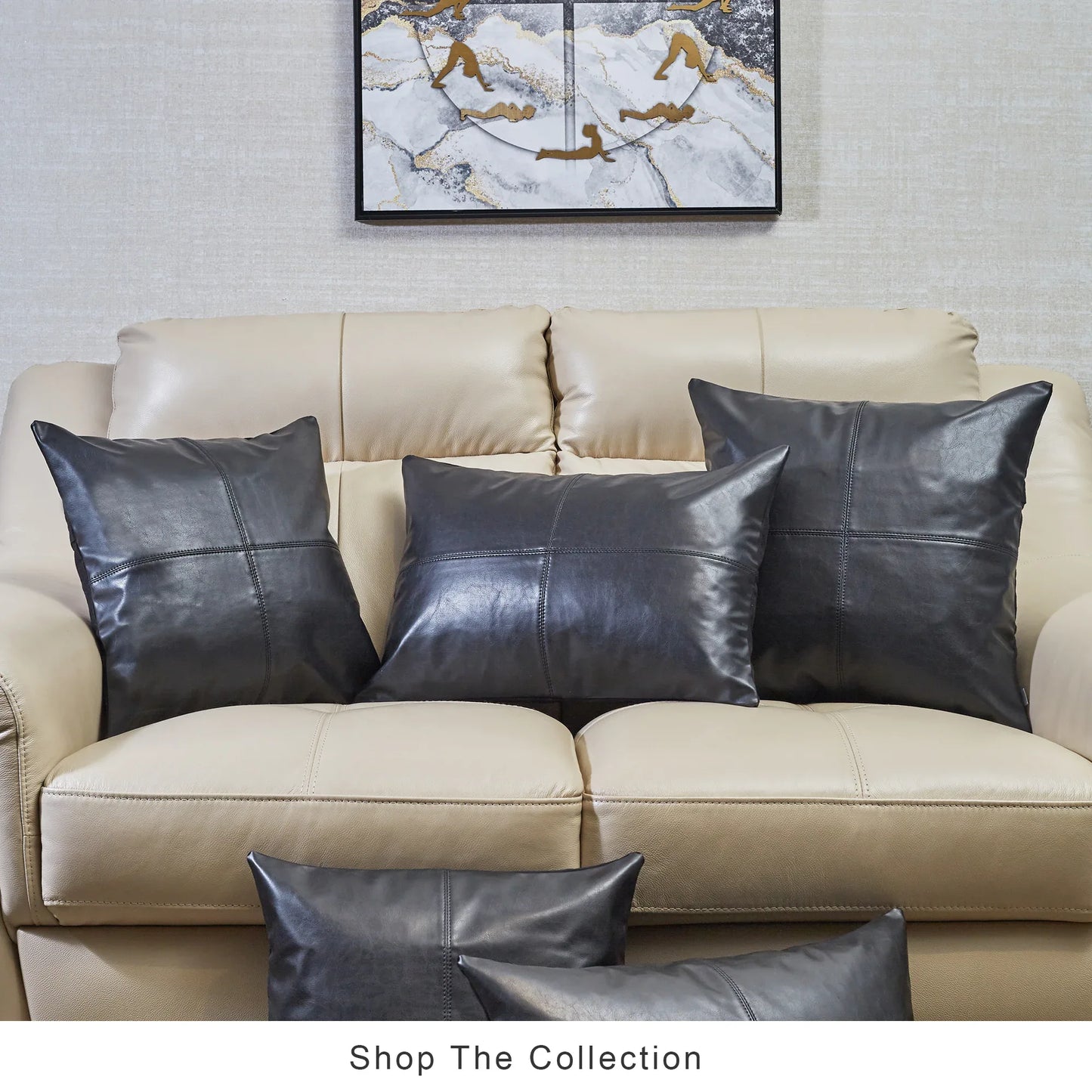 - Upholstered with vegan leather fabric on the front, this cushion cover exudes luxe leather looks with soft and breathable solid cotton back.