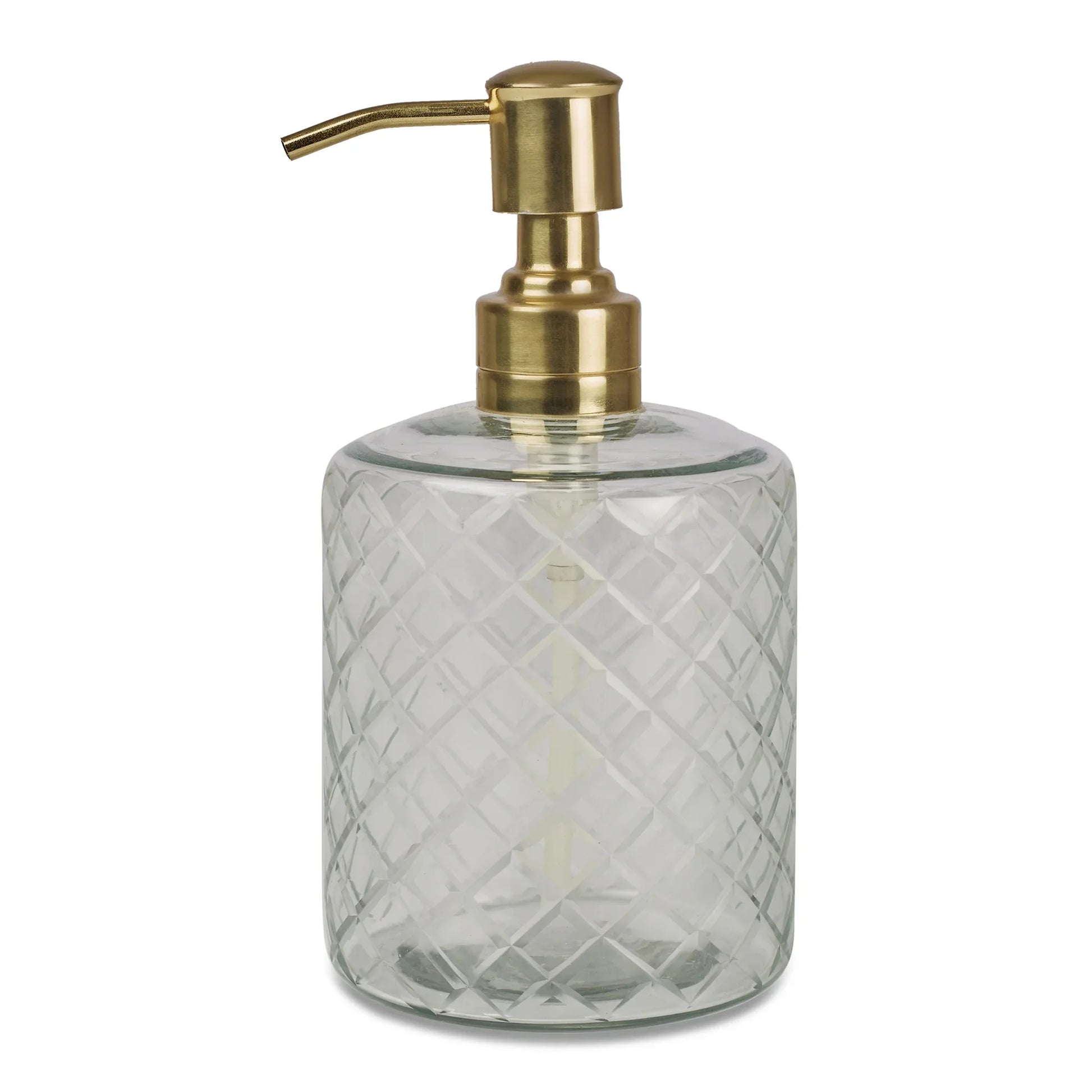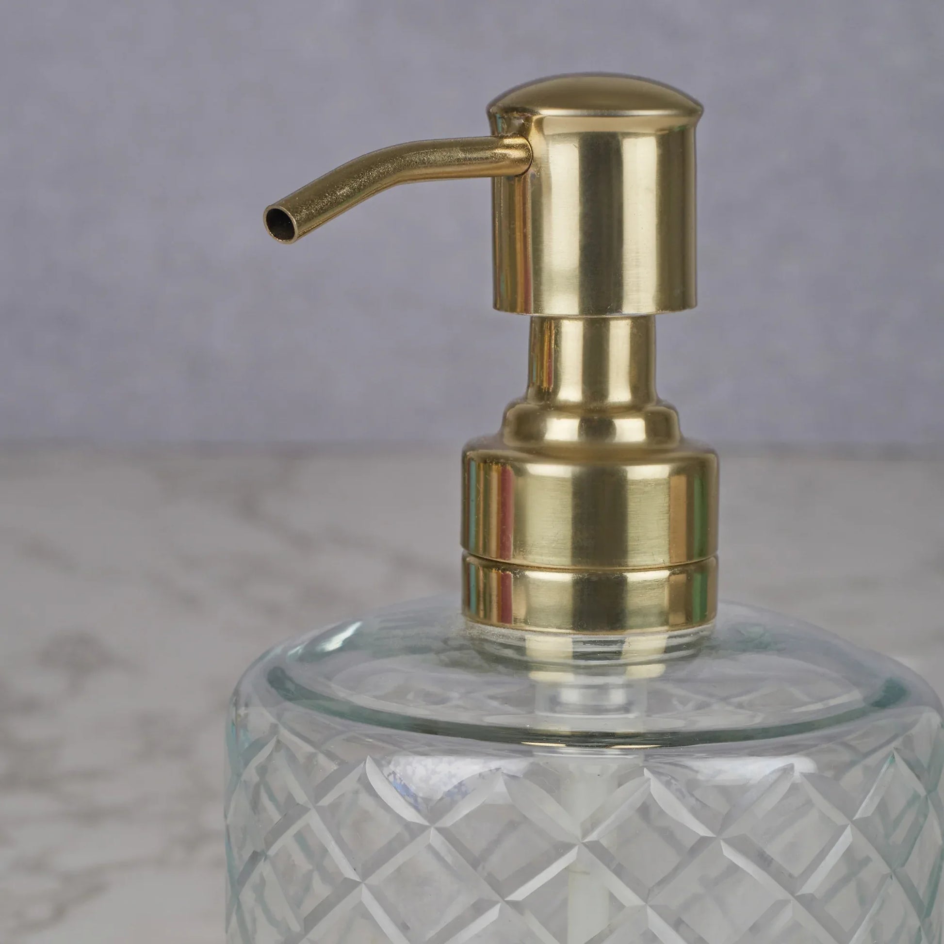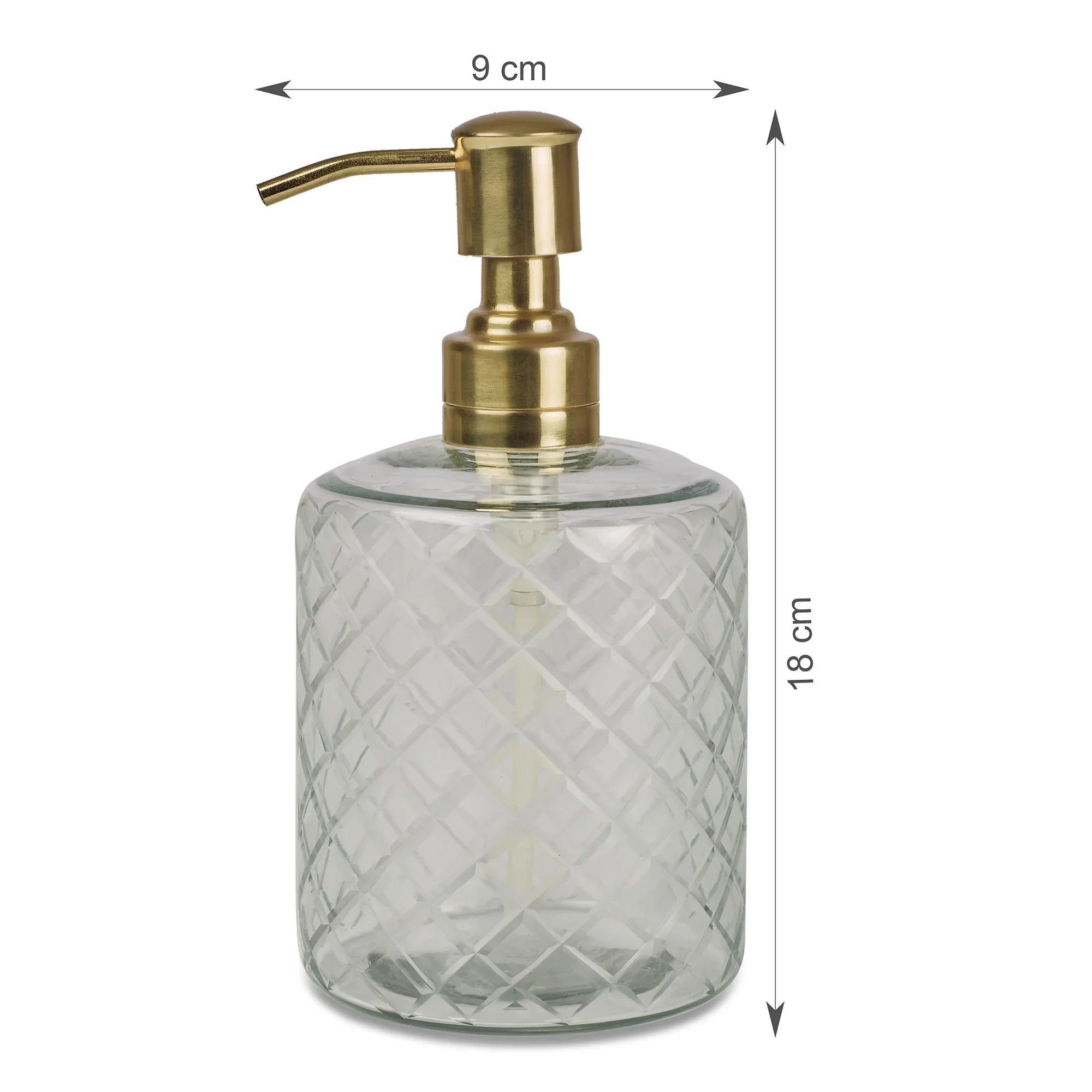 - The Nora clear glass liquid soap dispenser is a statement in elegance with its golden cutwork pattern. The transparent aesthetic adds luxurious design details to the set.