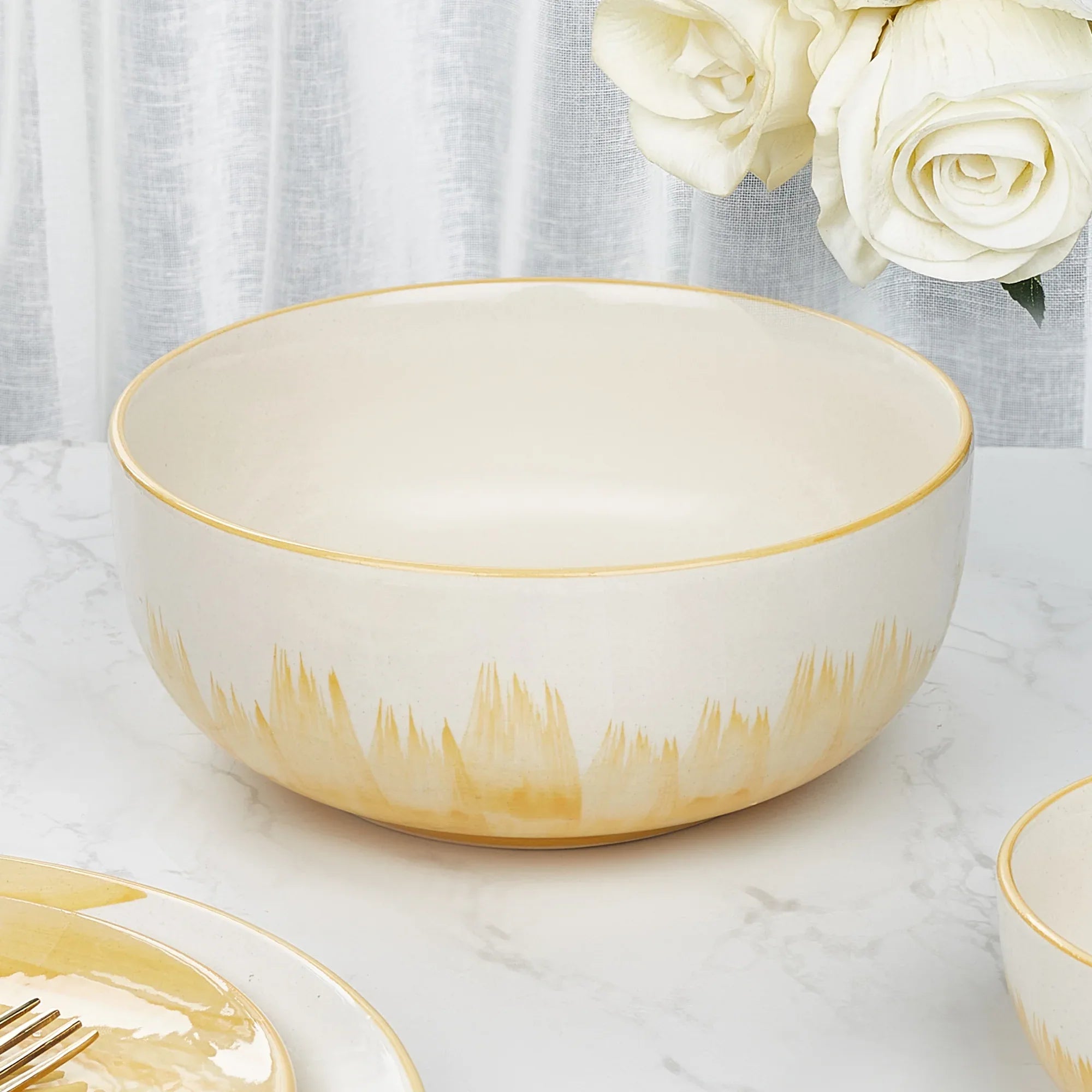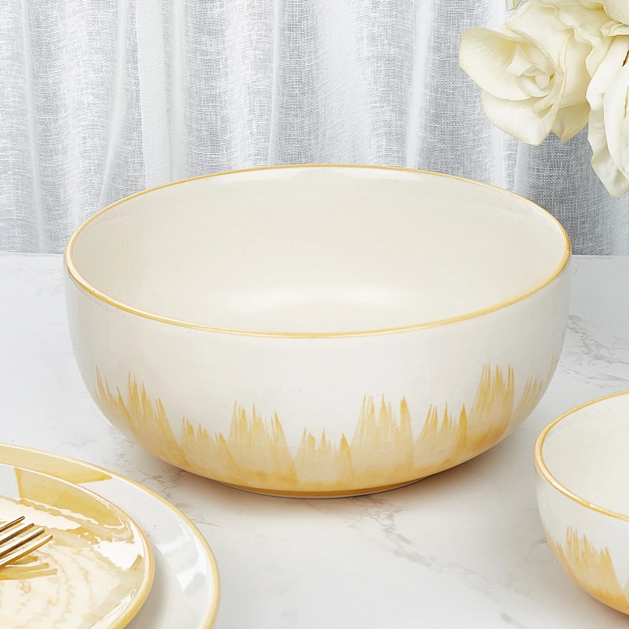 - Usher in a contemporary charm to your tablescapes with our Ophilia range of hand-crafted dinnerware. Bold ochre brush strokes over a neutral canvas creates dinnerware that promises to brighten & elevate your dining experience.