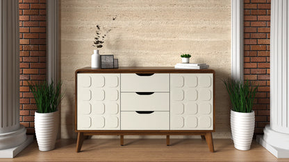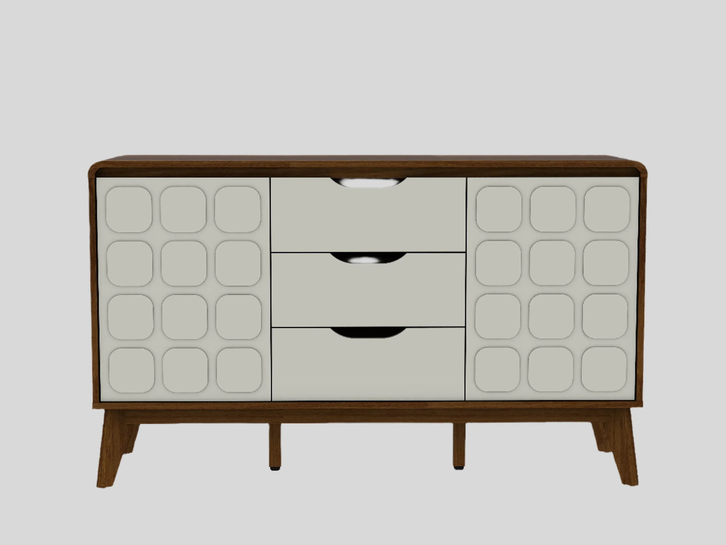 The front cabinet doors feature raised geometric squares, adding a touch of retro flair while keeping the overall design clean and modern.