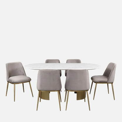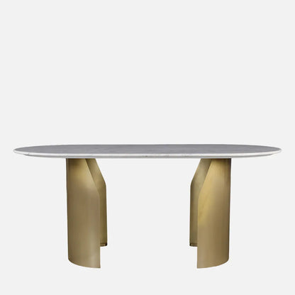 - This dinning table features oval-shape marble top with golden curvy metal leg, adding a unique and stylish touch to your room.
