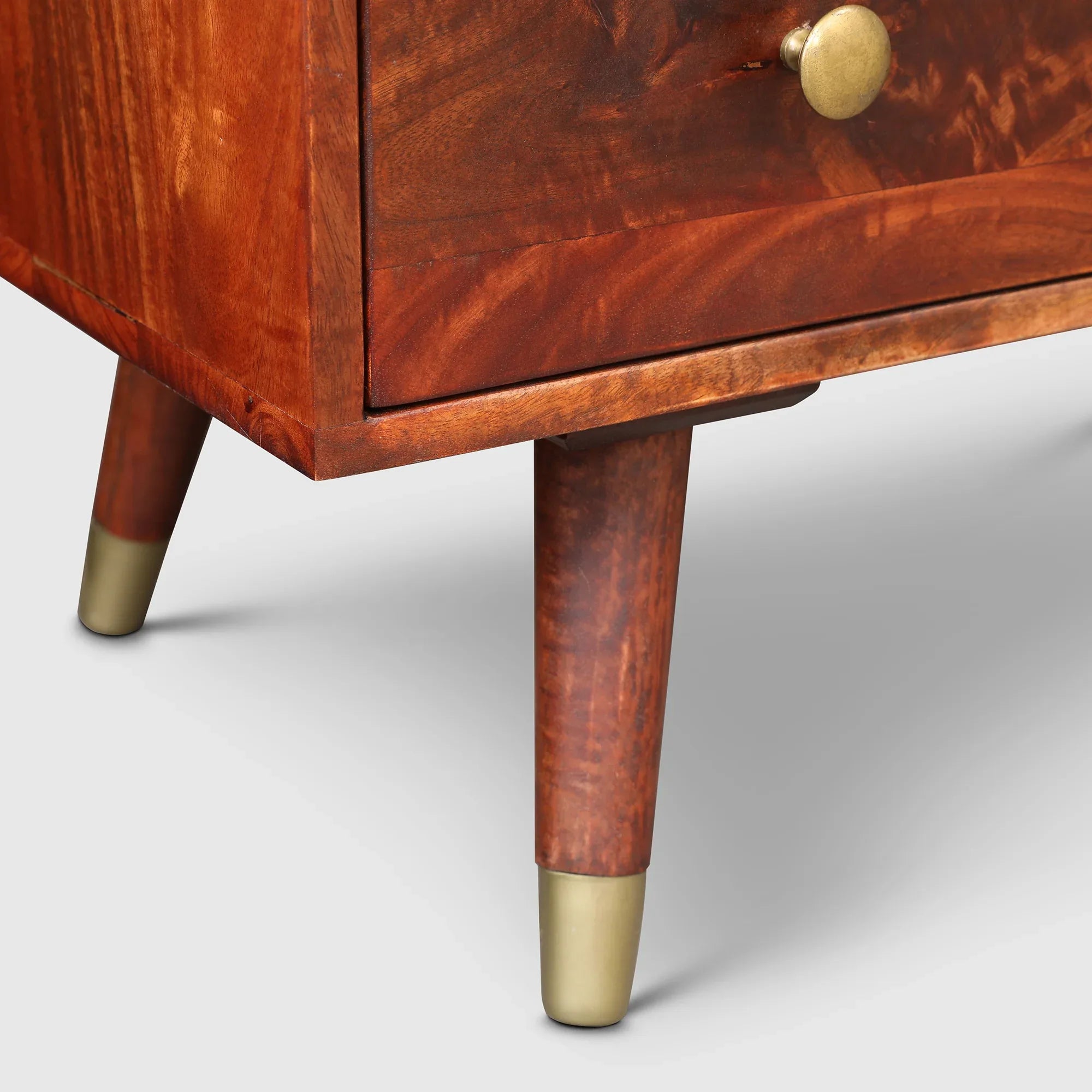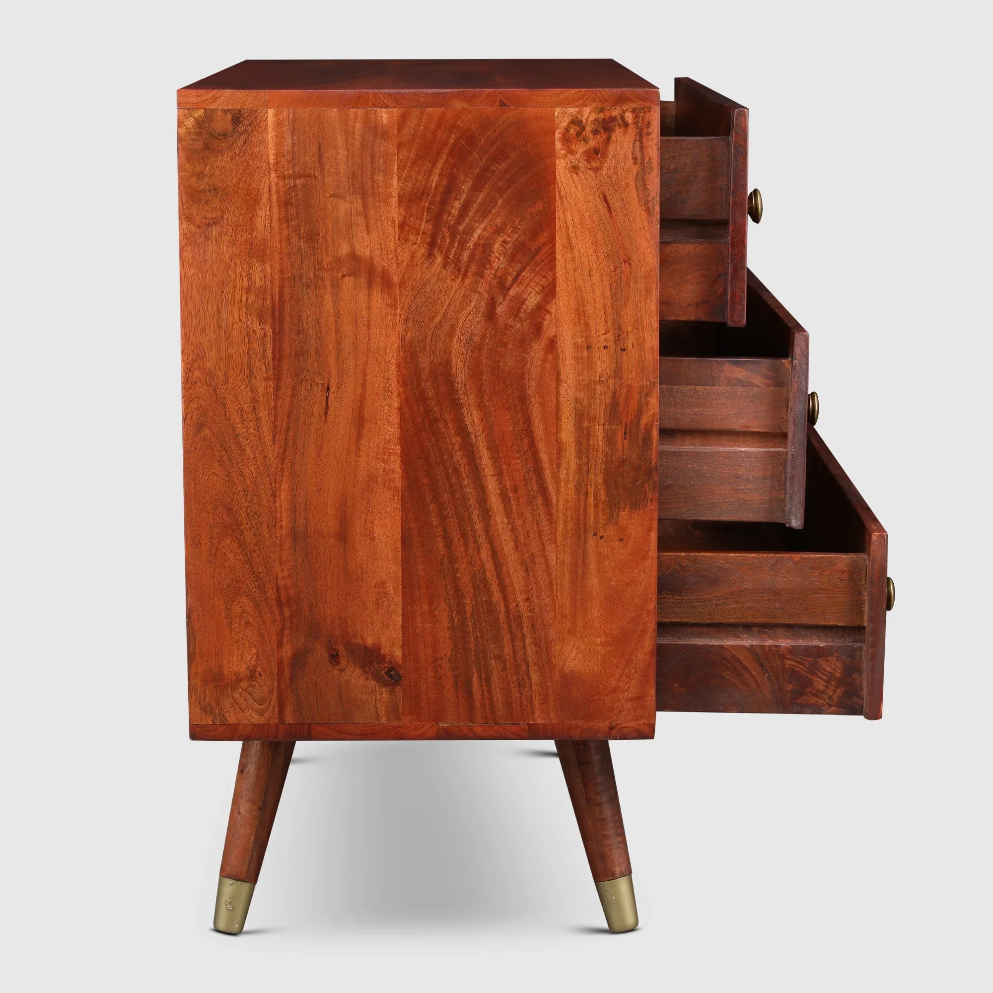 The Phoolkari chest of drawers is a luxurious statement, designed with modern aesthetic which fuses seamlessly with traditional design cues. Crafted in robust and elegant Sheesham, the chest of drawers offers a visual treat with geometric carvings on the drawer shutters with metallic gold knobs. The metallic inlay across the front profile captures it elegantly. Mid-century modern inspired angled legs with golden tips add grace to the already elegant chest of drawers. Pair this chest of three drawers with the Phoolkari bed, exuding the natural wood grain of Sheesham.