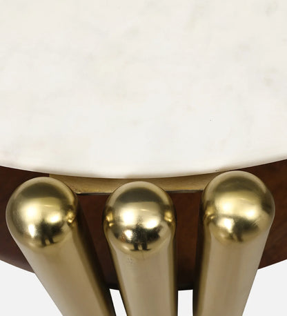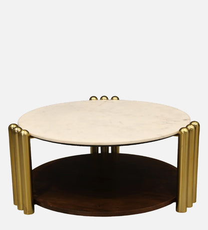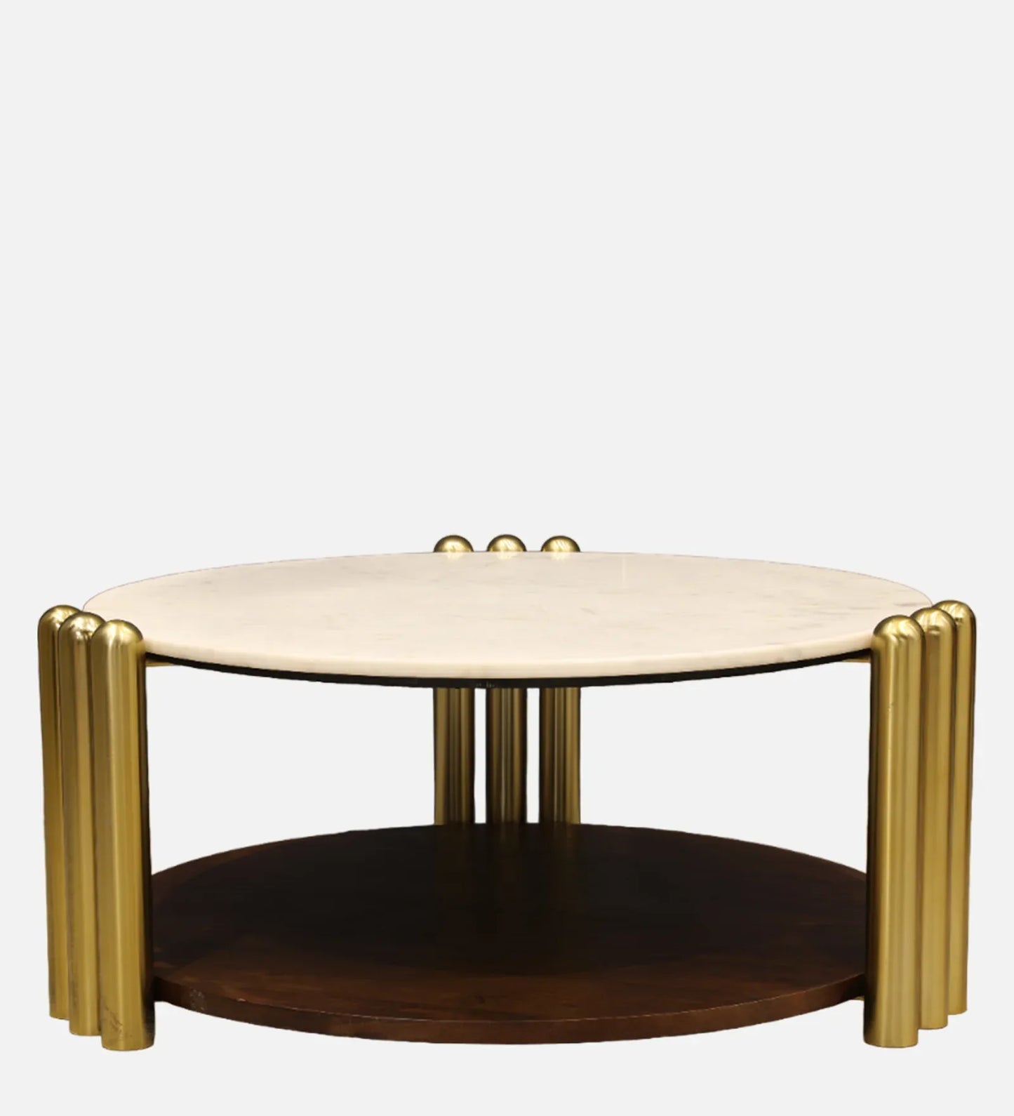 - The construction of the Regalia Center Table is designed to exude both style and durability. With its round table design featuring a white marble top and a wooden shelf, this piece adds a modern and sophisticated touch to any living room.