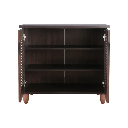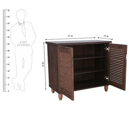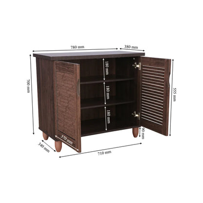 The two door Riveria shoe rack, is contemporary in its design with utility maximization in its function. French louvres shutters amp up the design detail of the wenge shoe rack while offering ventilation for your shoes, allowing them to be fresh and odour free all the time. Use the top of the shoe rack as a quick access storage, styling it with bowls or decor it up with your favourite vases, etc. The modern leg detail gives the shoe rack its unique look and style.