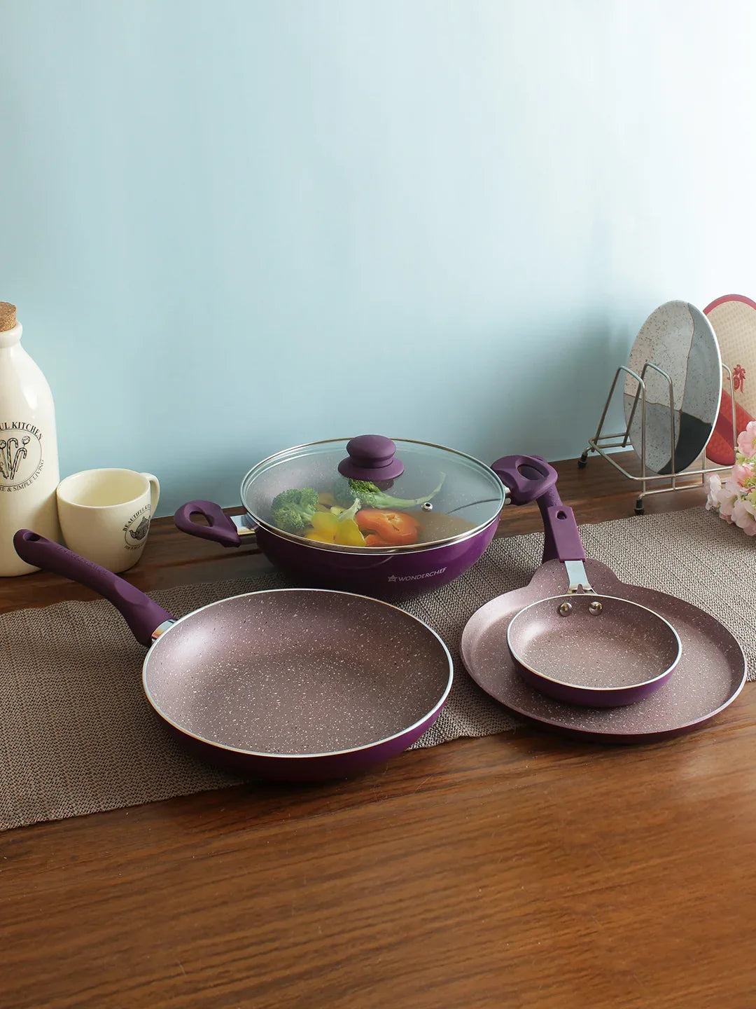 - Wonderchef Royal Velvet Set includes large-sized 24 cm Wok, Fry Pan & 24 cm Dosa Tawa with a common lid, 14 cm Mini Fry Pan, thus providing a complete cooking solution for healthy and low-fat home-cooked meals. Finest non-stick coating for healthy, low fat, and delicious meals.