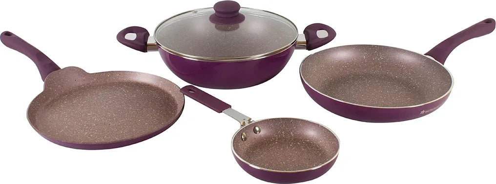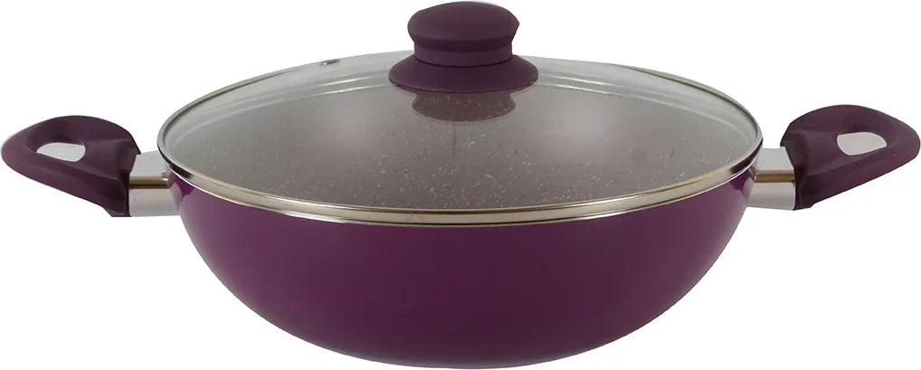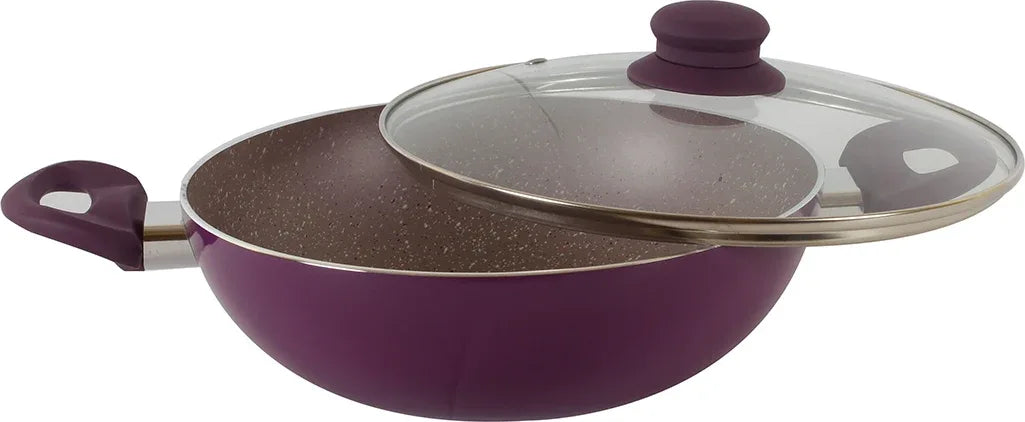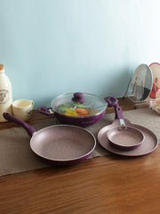 Royal Velvet Non Stick Induction Bottom Cookware Set Of 5 Pcs , 1 Wok With Lid 24Cm 2.3Ltr, 1 Frypan 24Cm 1.7 Ltr, 1 Dosa Tawa 24Cm, 1 Mini Frying Pan 14Cm in Purple Colour