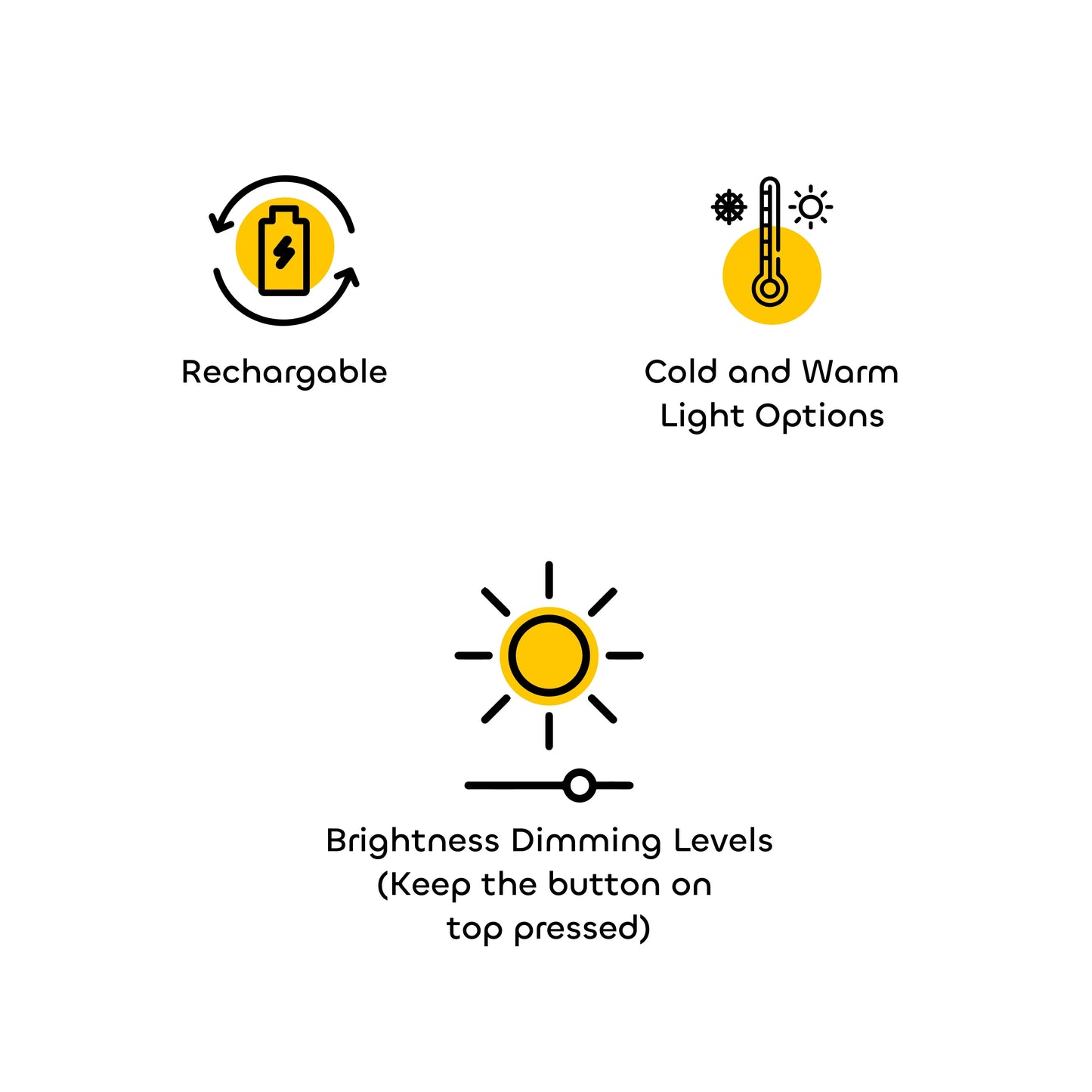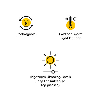 - Press the button on top to switch the light on and off; Move the button underneath the lamp to alternate between cold and warm light