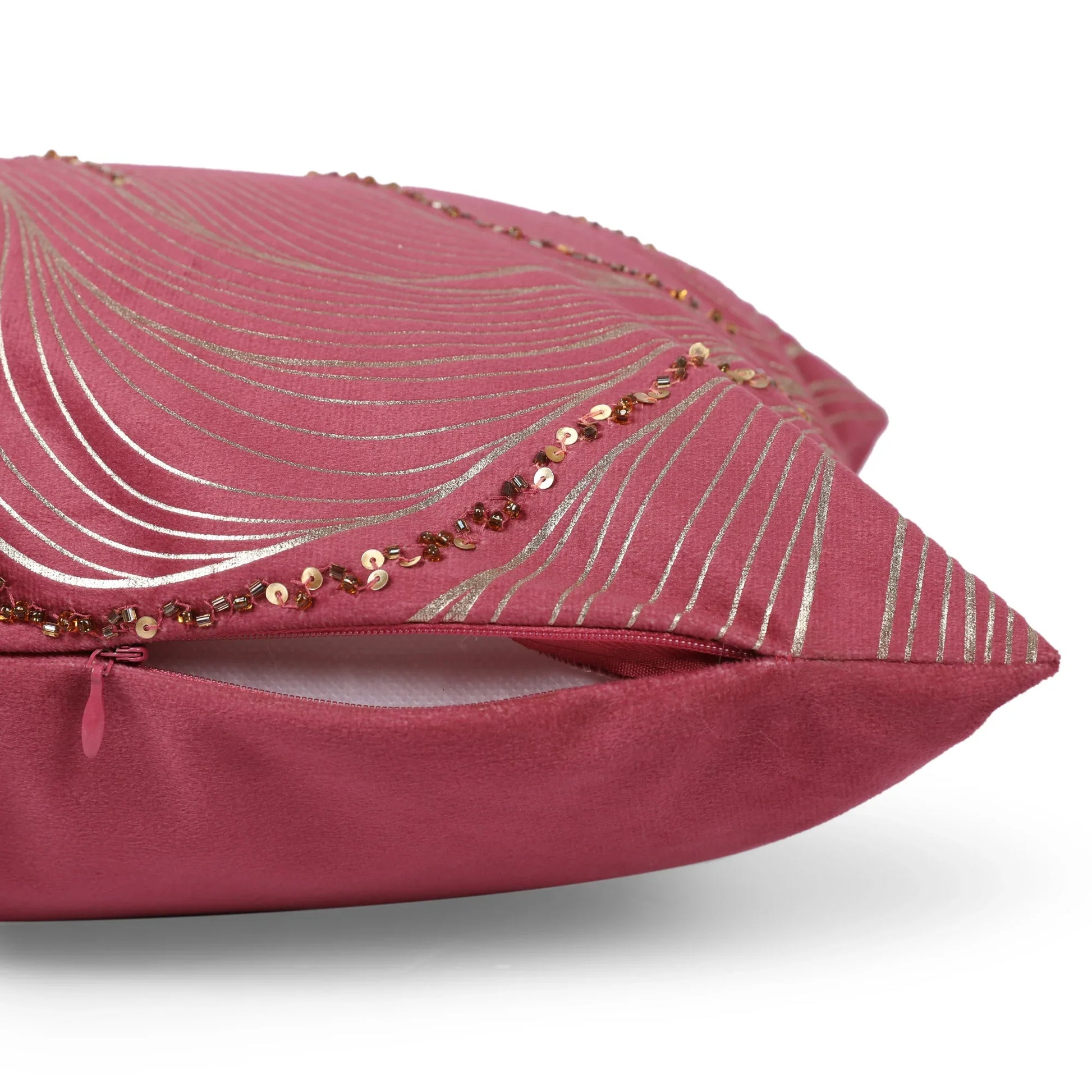 - Elevate your decor with our exquisite cushion covers adorned with computerized beaded embroidery work. Each cover is a masterpiece of precision and artistry, meticulously crafted to add a touch of glamour and sophistication to any space. The intricate beadwork creates a stunning visual texture, catching the light and adding depth to your furnishings. Whether placed on a sofa or armchair, these covers effortlessly infuse your home with elegance and luxury, making a statement that speaks volumes about your impeccable taste.