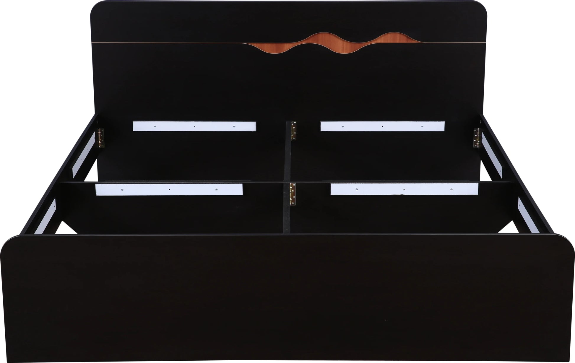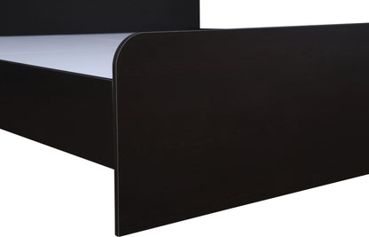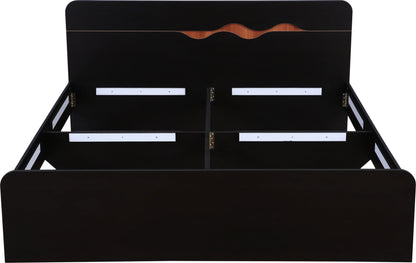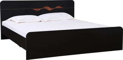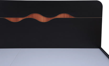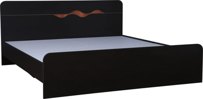 The sleek Swirl engineered wood queen bed without storage in modern-contemporary styled construct has a distinct organic shaped carvings on the headboard with soft rounded corners gives it an elegant edge with natural wood grain finish.