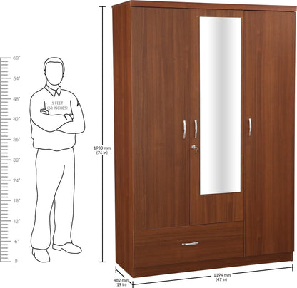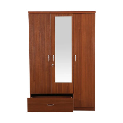 The engineered wood, Ultima three door wardrobe with mirror in natural wood grain finish is a classic. External bottom drawer is provided for footwear. Its ergonomic fittings makes the design user-centric.