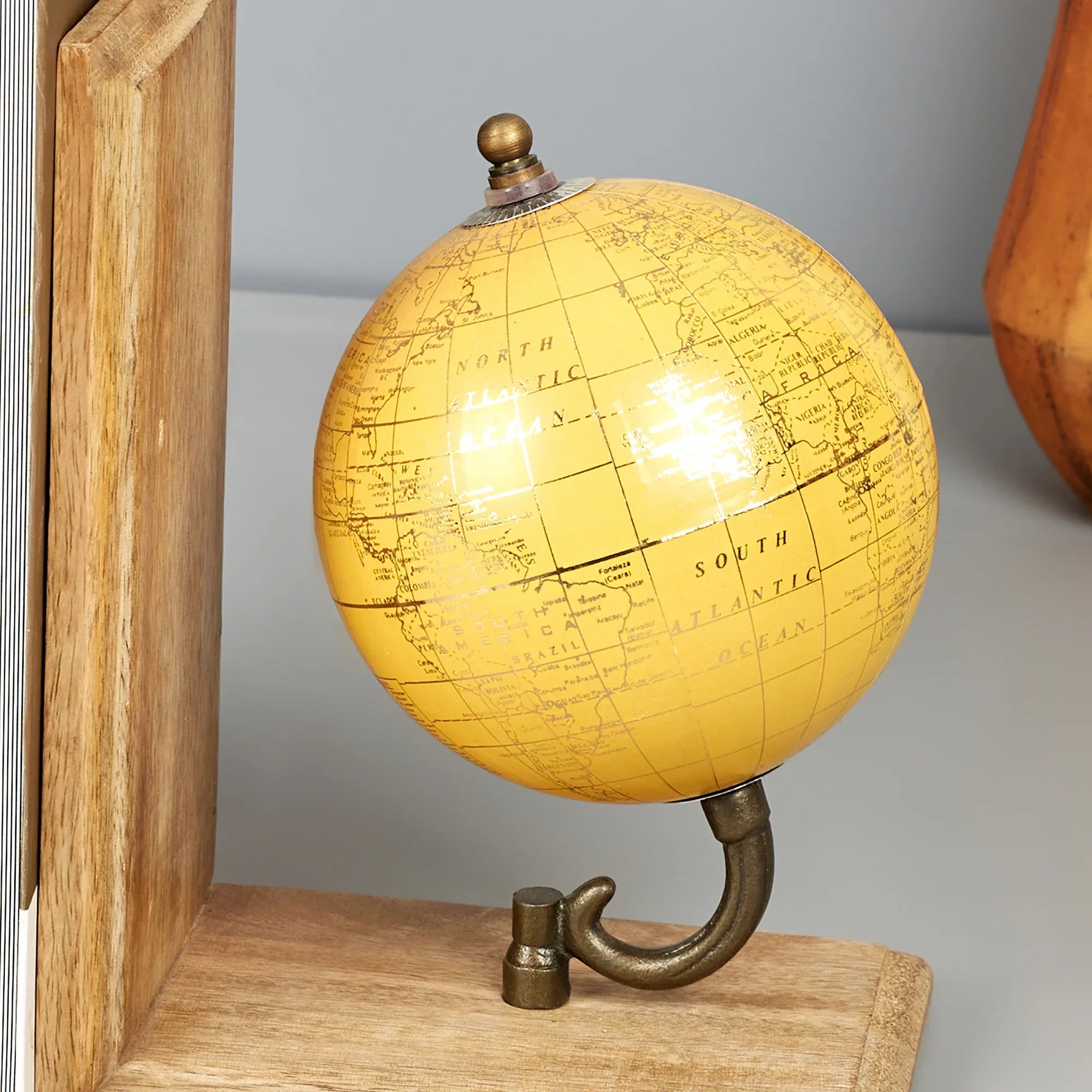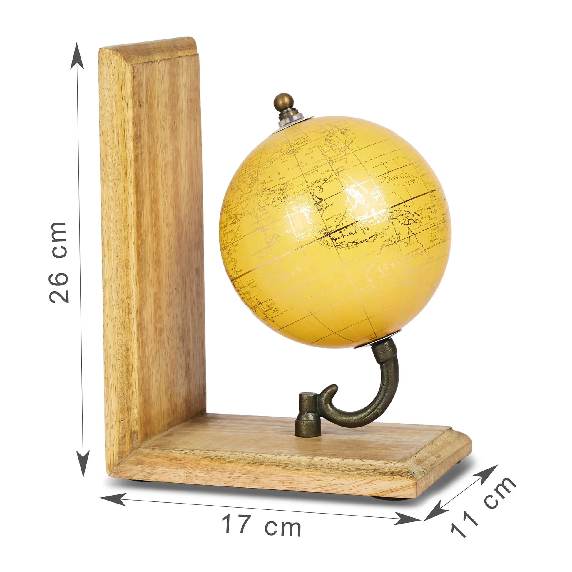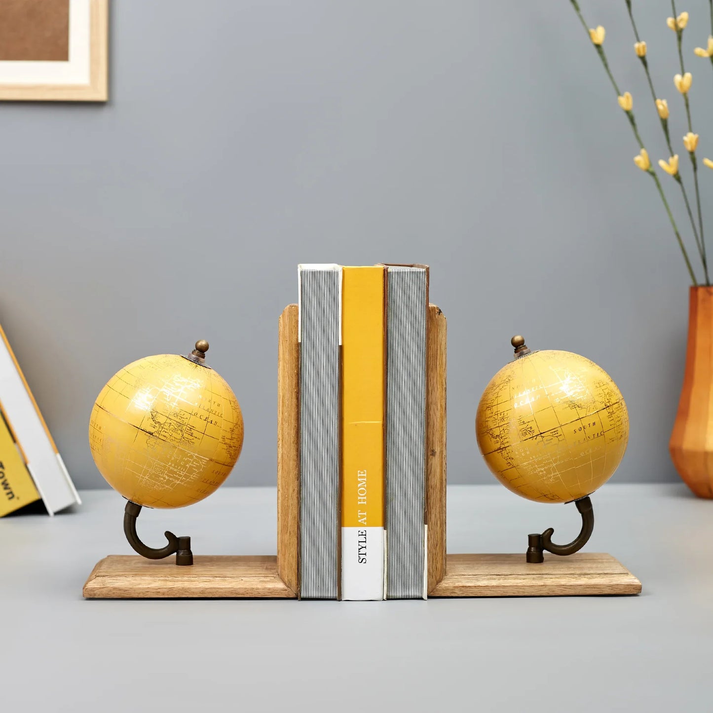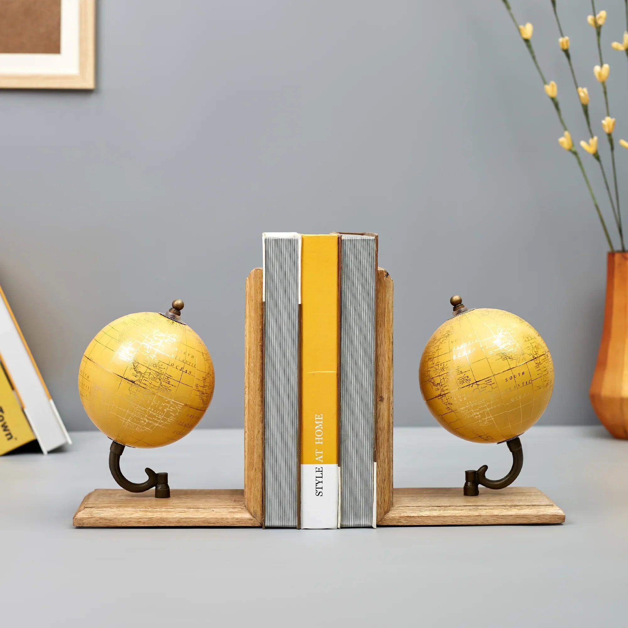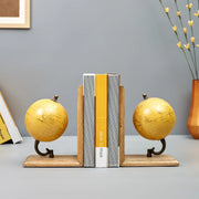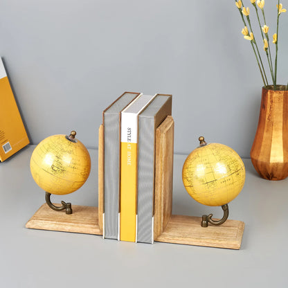 - For the globe trotter in you, this set of two mustard colored bookends from Hometown will add a modern touch to your library. Spotlighting mini globes accented with World map printed on them, they sit atop a wooden base. Use them to organise your books, novels and magazines in a stylish way.